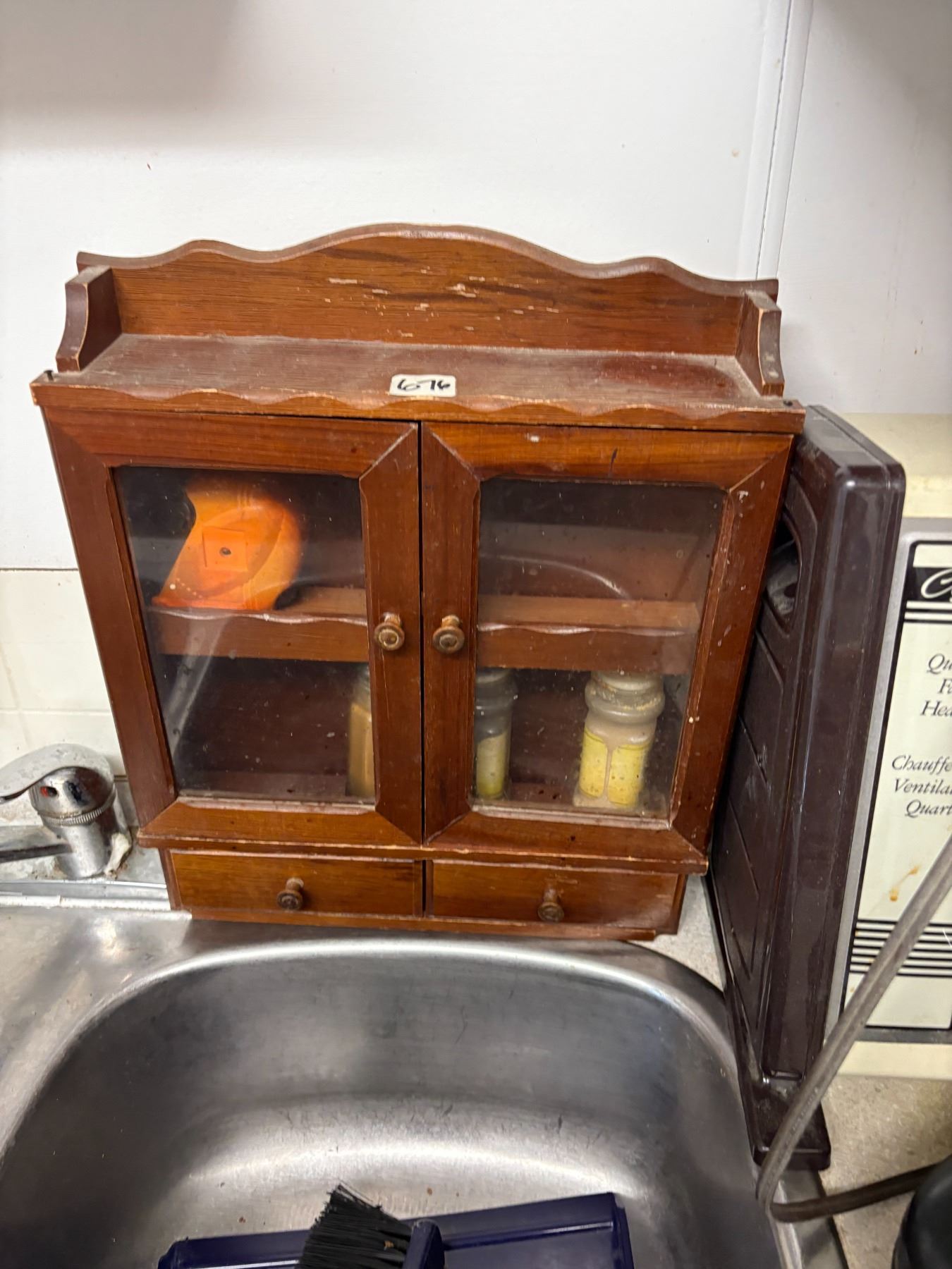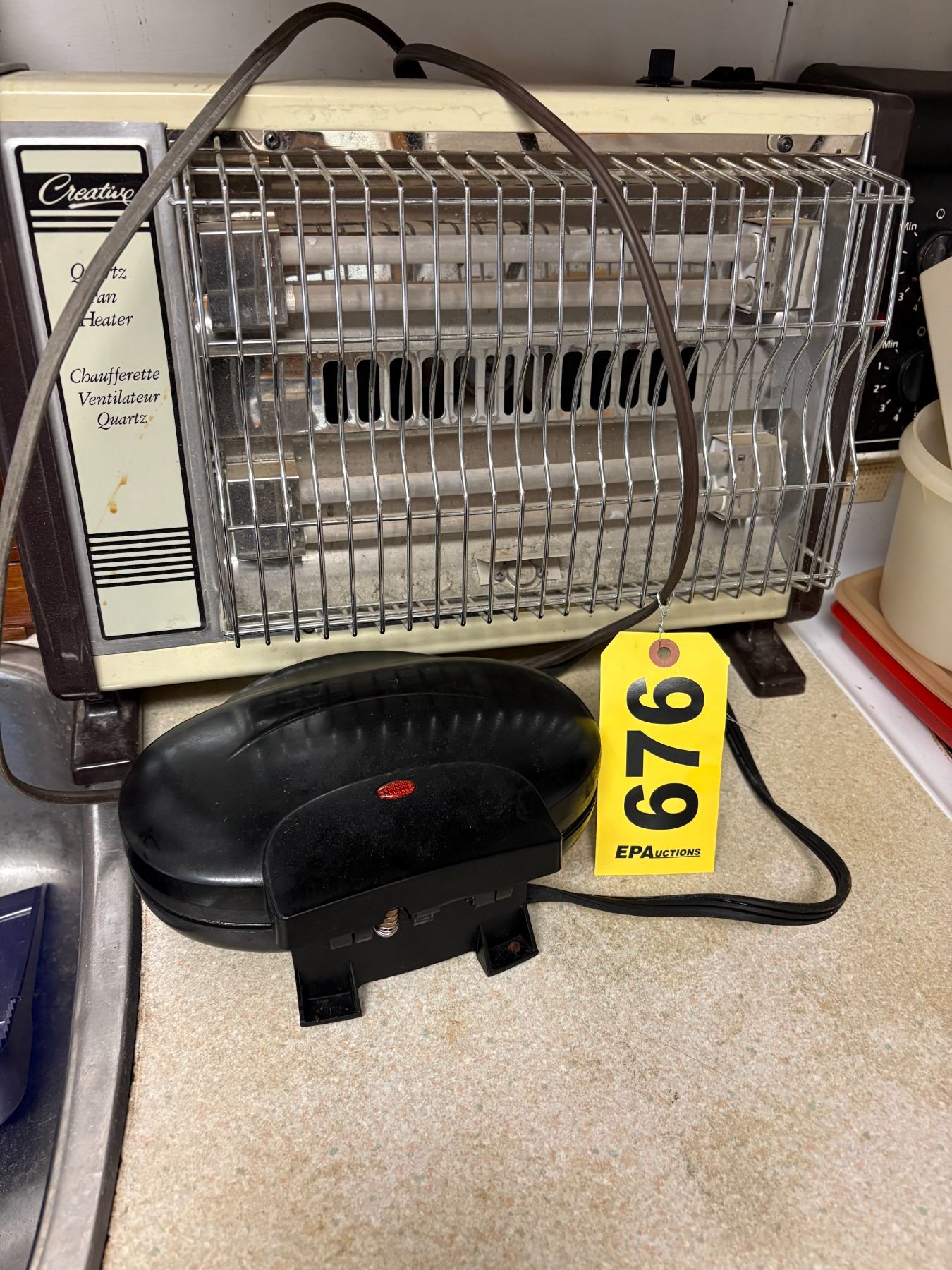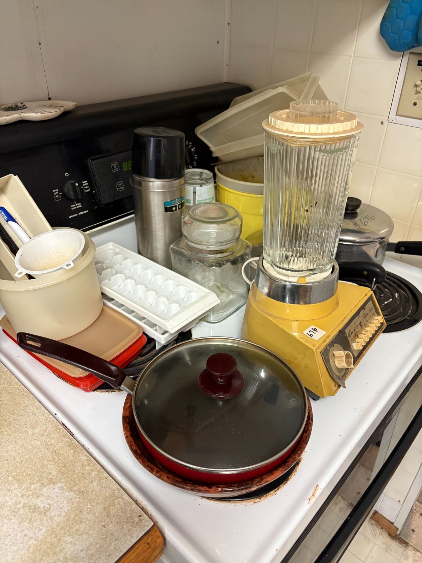 Space heater, spice rack, blander, frying pan, ice tray, thermos, canister etc. Located on counter