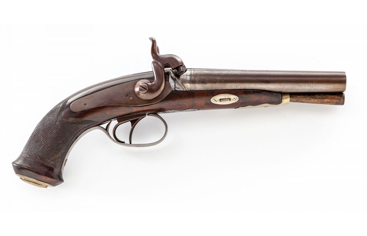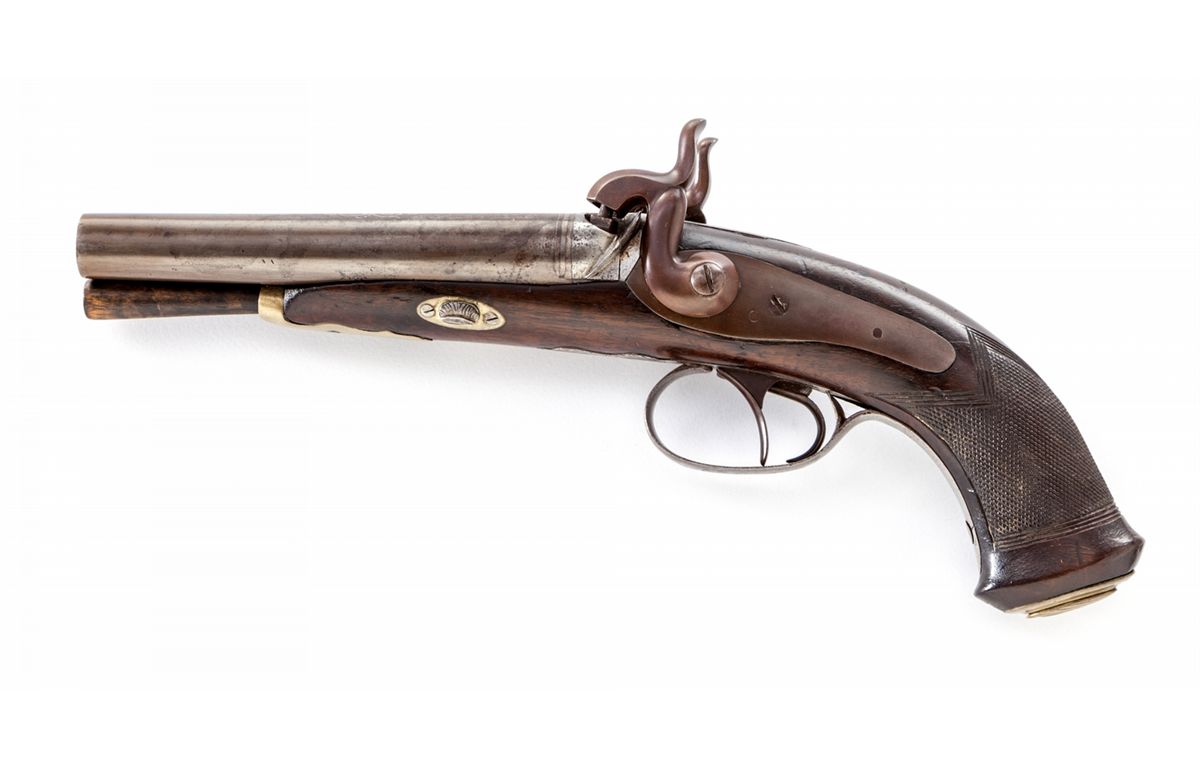 Spanish Side-by-Side Percussion Coat Pistol, 16 ga., 5-3/4'' barrels lightly inlaid with scroll and marked ''Fabrica de Elgoibar Ano 1864'', with lightly engraved tang, barrel plugs, triggerguard and wedge; nickel silver escutcheons and clamshell trapdoor butt cap; with checkered walnut stock. Condition is fine to near excellent. Markings are clear with toning to barrels and lockplates. Action is in good working order with minor flattening to checks on grip. Est.: $800-$1,200. (Antique)