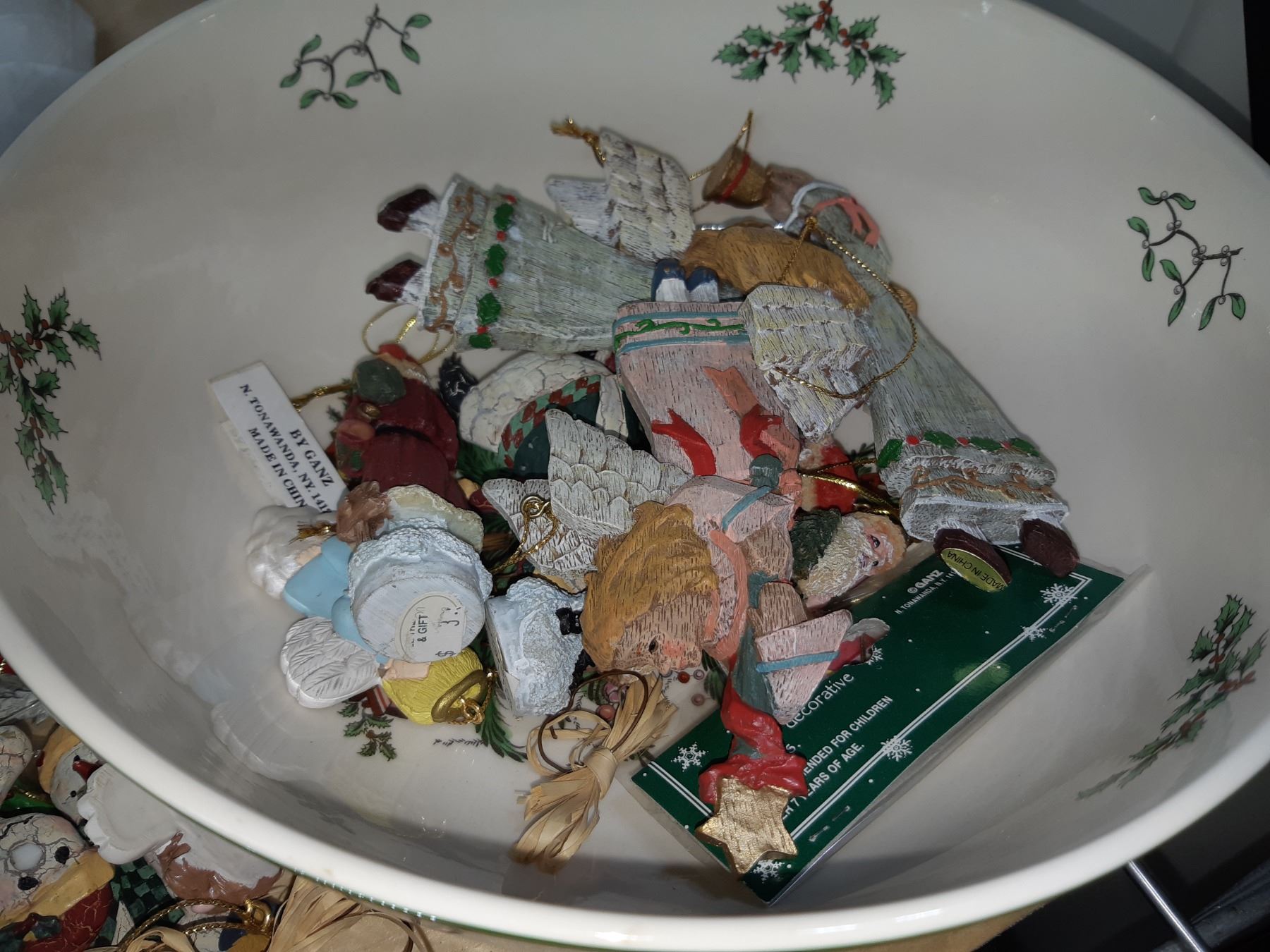 Serving bowl 10" and serving dish with handle. Xmas tree ornaments. Pickup at 9 am