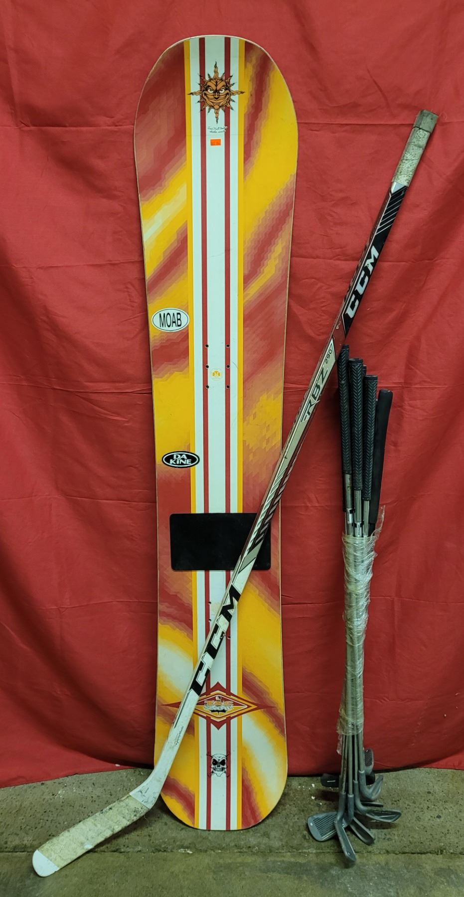 Sporting Good Lot w/ Assorted Golf Clubs, Hockey Stick, & Snowboard