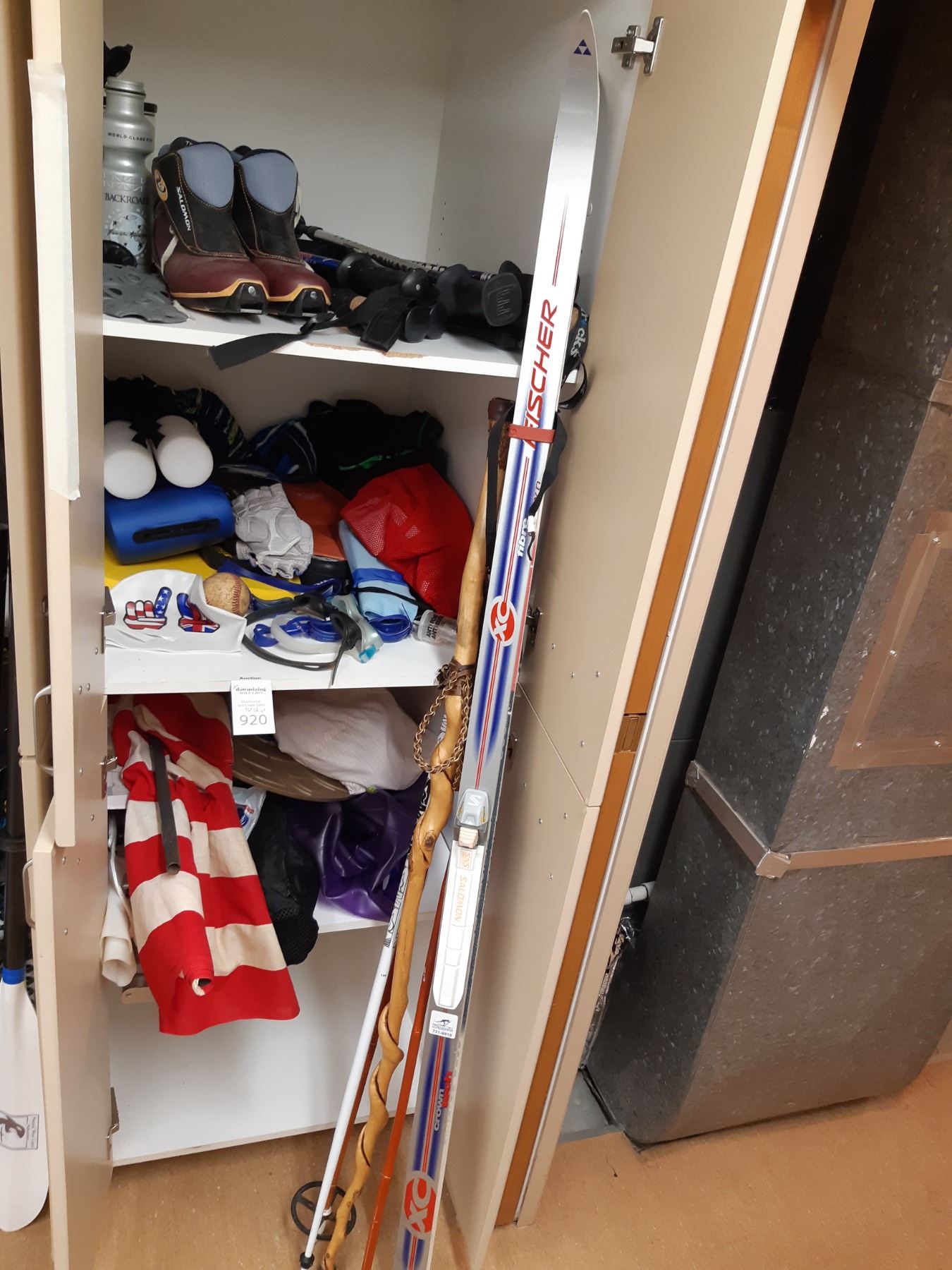 Cross country 190 skis, poles, size 7 Salomon boots, Speedo braces, swim board, goggles, yoga mat, walking cane and more included. Bring boxes. Pickup at 9 am.