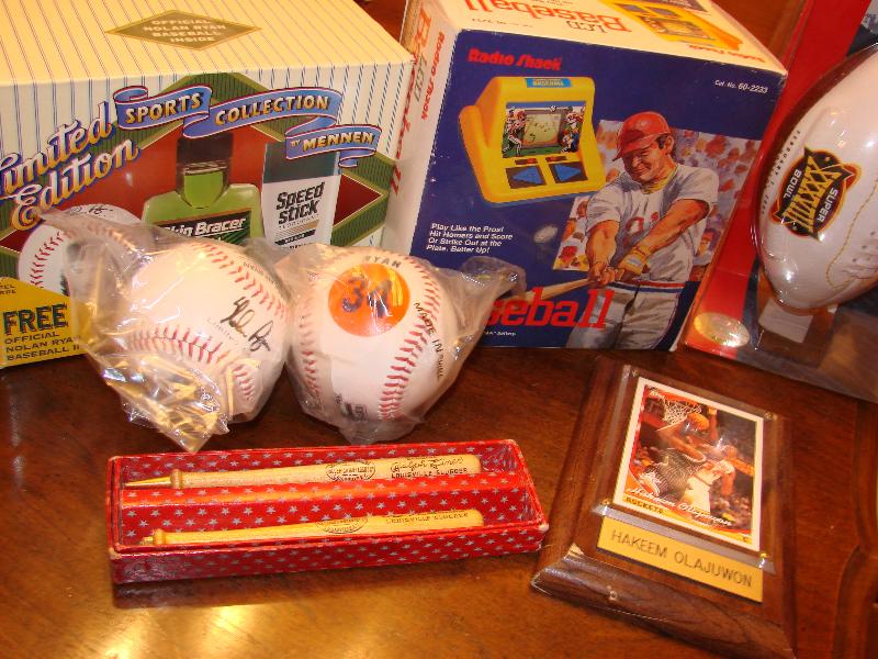 5 sporting items:Hakeem Topps card,slugger ink pins,Nolan Ryan balls