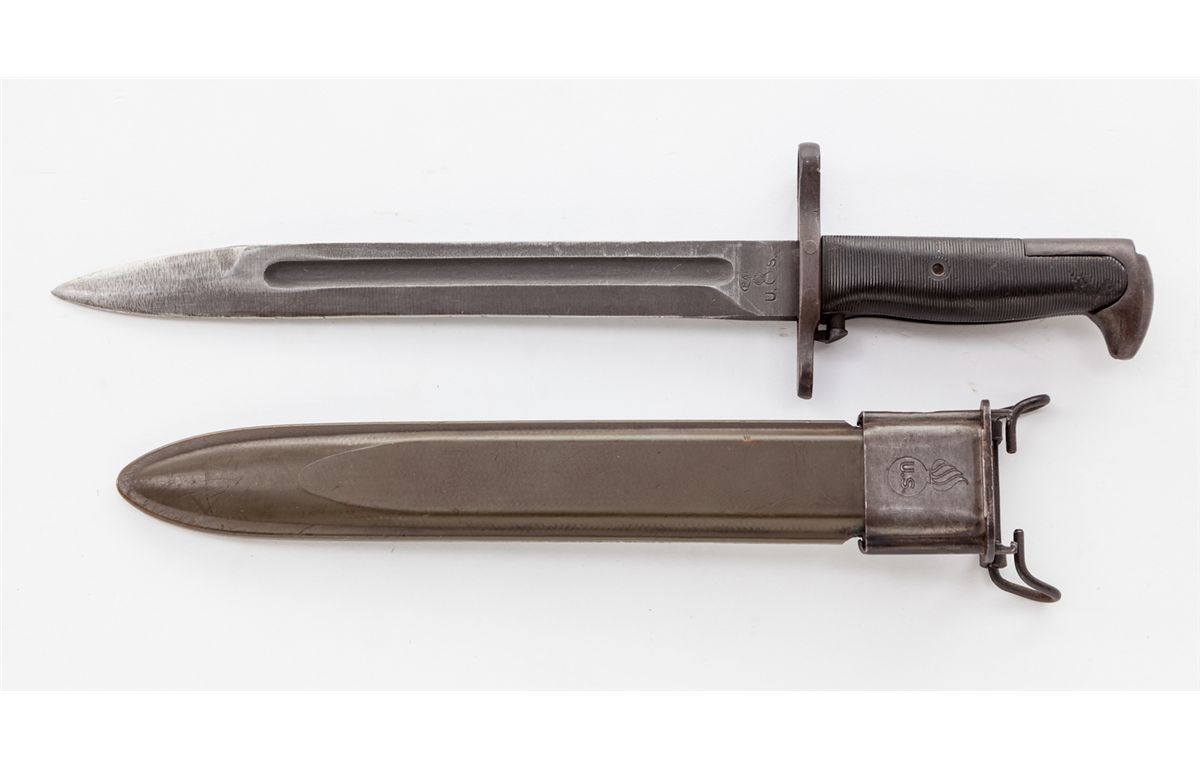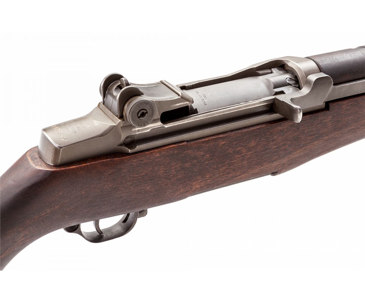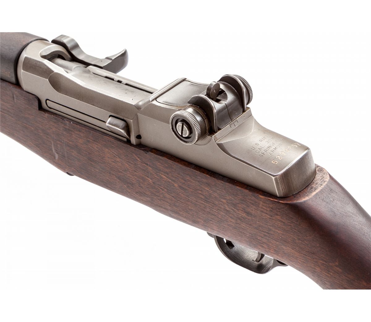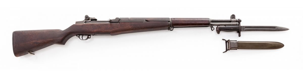 U.S. M1 Garand Semi-Automatic Rifle, by Springfield, #5293857, .30-06 cal., 24'' barrel, parkerized finish, dark stained birch stock and handguard, complete with 10'' bayonet by PAL. Barrel is marked ''LMR'' and dated 11-53. Receiver is marked beneath the stock line in electric pencil ''3-65'' indicating time of last overhaul and was sold in the 1980s to the Dept. of Civilian Marksmanship. Condition is excellent as overhauled retaining approx. 95% of its original lightly thinning finish to metal. Stock with only the slightest marks from handling. Action is crisp, bore is excellent. Butt trap with cleaning accessories. A great non-import marked M1 Garand. Est.: $800-$1,200. (C&R)