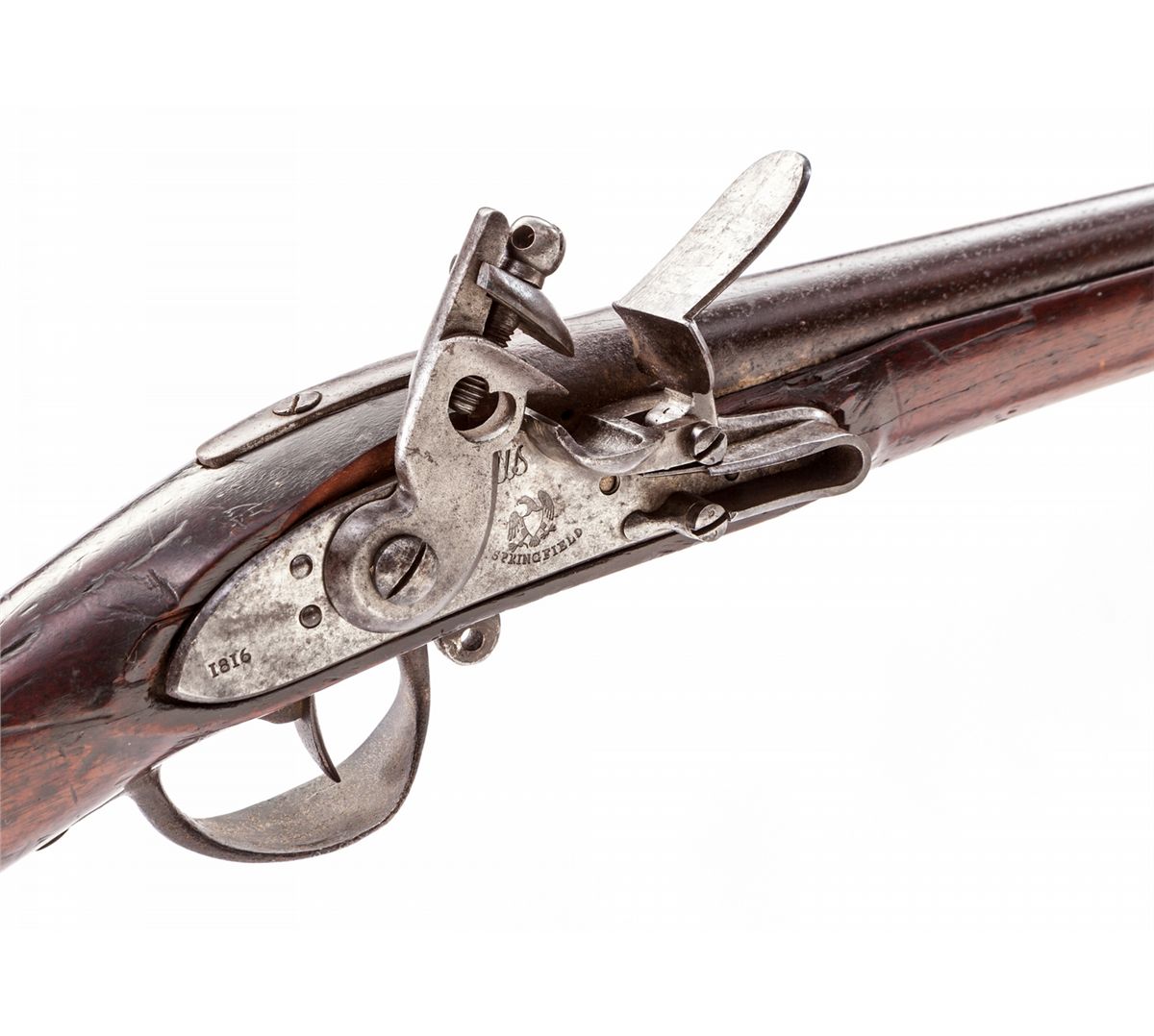 U.S. Model 1812 Flintlock Musket, by Springfield, .69 cal., 41-1/2'' barrel, three iron barrel bands, all iron mountings, metal parts originally finished bright, full-length walnut stock with oval clearance cut for cheek on left side of butt. Lockplate dating 1816. missing ramrod and swivel loops. Condition is good to very good with dark overall patination to metal surfaces. Stock with moderate scuffs and dings. Action is good and functioning, bore has toned. Est.: $2,000-$3,000. (Antique)
