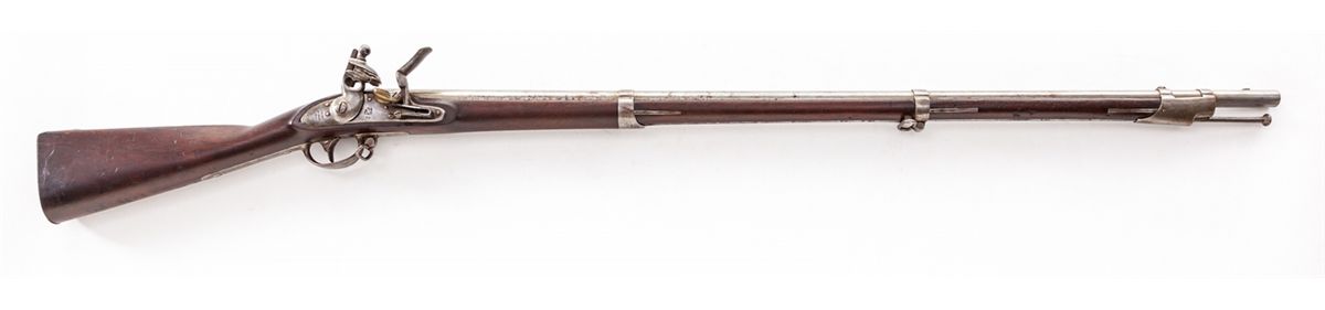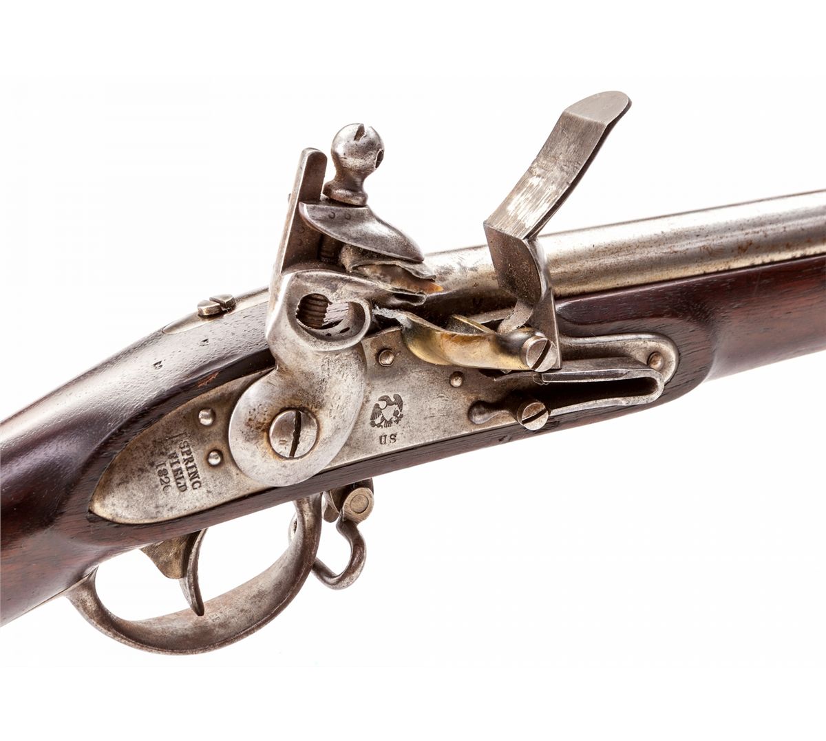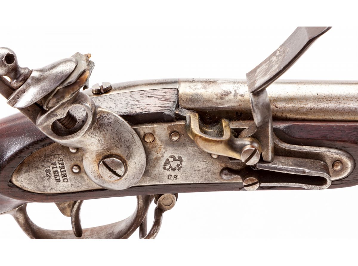 U.S. Model 1816 Flintlock Musket, by Springfield, .69 cal., 42'' barrel, three iron bands, metal parts finished bright, detachable brass flash pan, lightly cartouched walnut stock, and U.S. marked steel buttplate. Lockplate marked ''Springfield 1820'' with ''(Federal eagle)/U.S.''; upper tang dated 1820. Breech portion of barrel with circle-''P/(eaglehead)/V''; additionally marked ''K/r/96''. Ramrod is present. Condition is fine with minor toning to bright surfaces of barrel, as possibly re-converted from percussion. Stock with light scuffs and scratches. Oval cartouche is mostly clear and legible behind sideplate, as well as small cartouches behind triggerguard tang. Action is good and functioning, bore is mirror bright. Est.: $1,800-$2,400. (Antique)