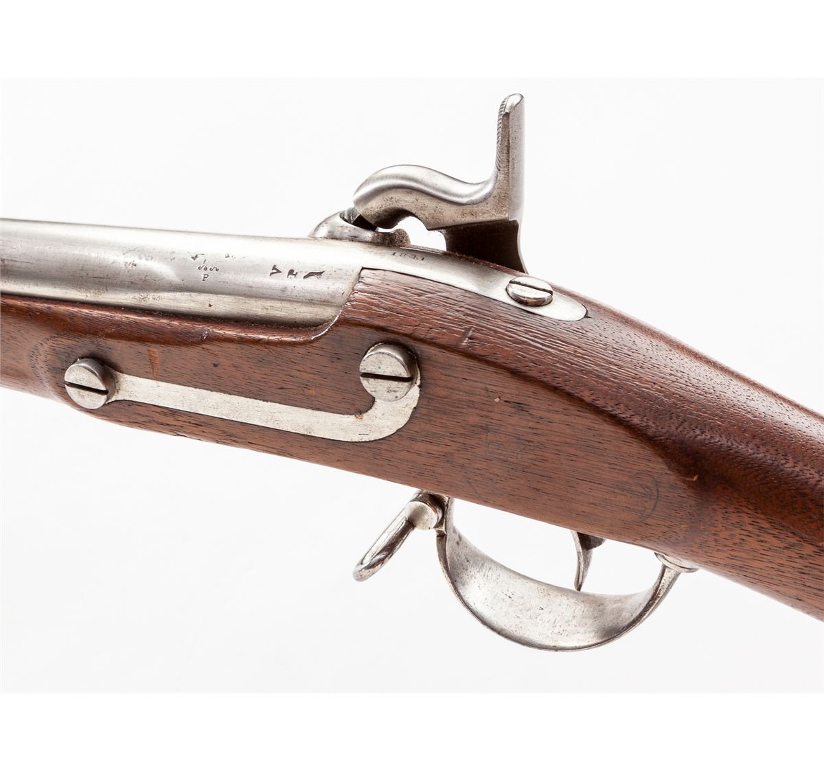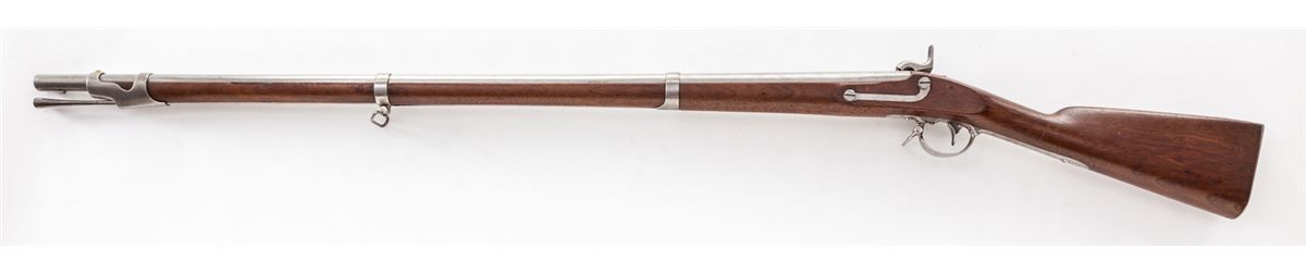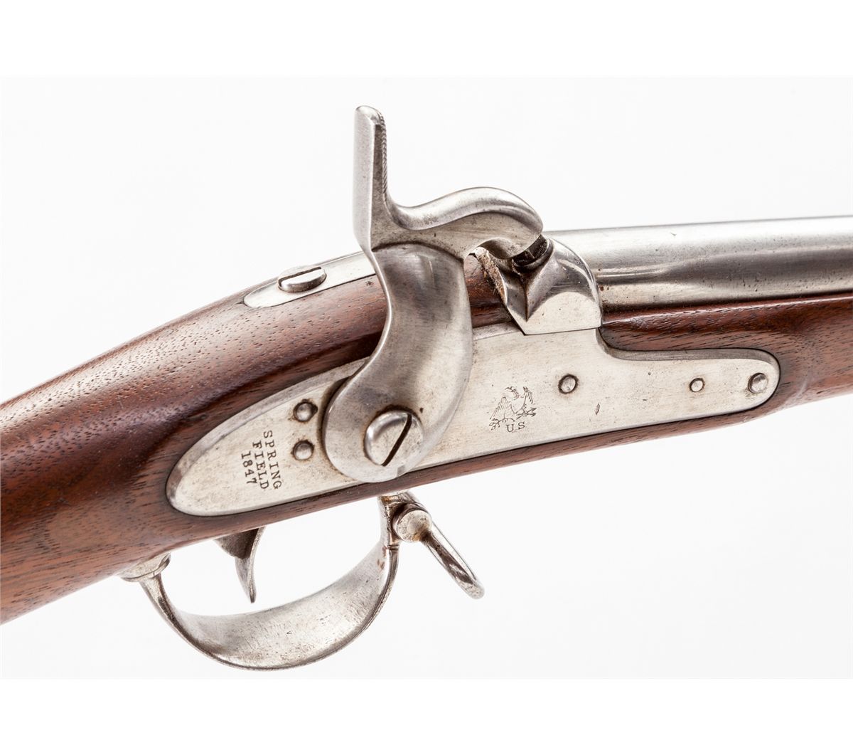 U.S. Model 1842 Percussion Musket, by Springfield, .69 cal., 42'' barrel, three iron bands, finished in the white, faintly cartouched walnut stock, with ramrod. Lockplate and tang dated 1847. Rear portion of lockplate marked ''Spring/field/1847'', with Federal eagle over ''U.S.'' on hammer. Condition is excellent as lightly cleaned. Stock shows very minor sanding. Action is crisp, bore is very good. Est.: $1,800-$2,400. (Antique)