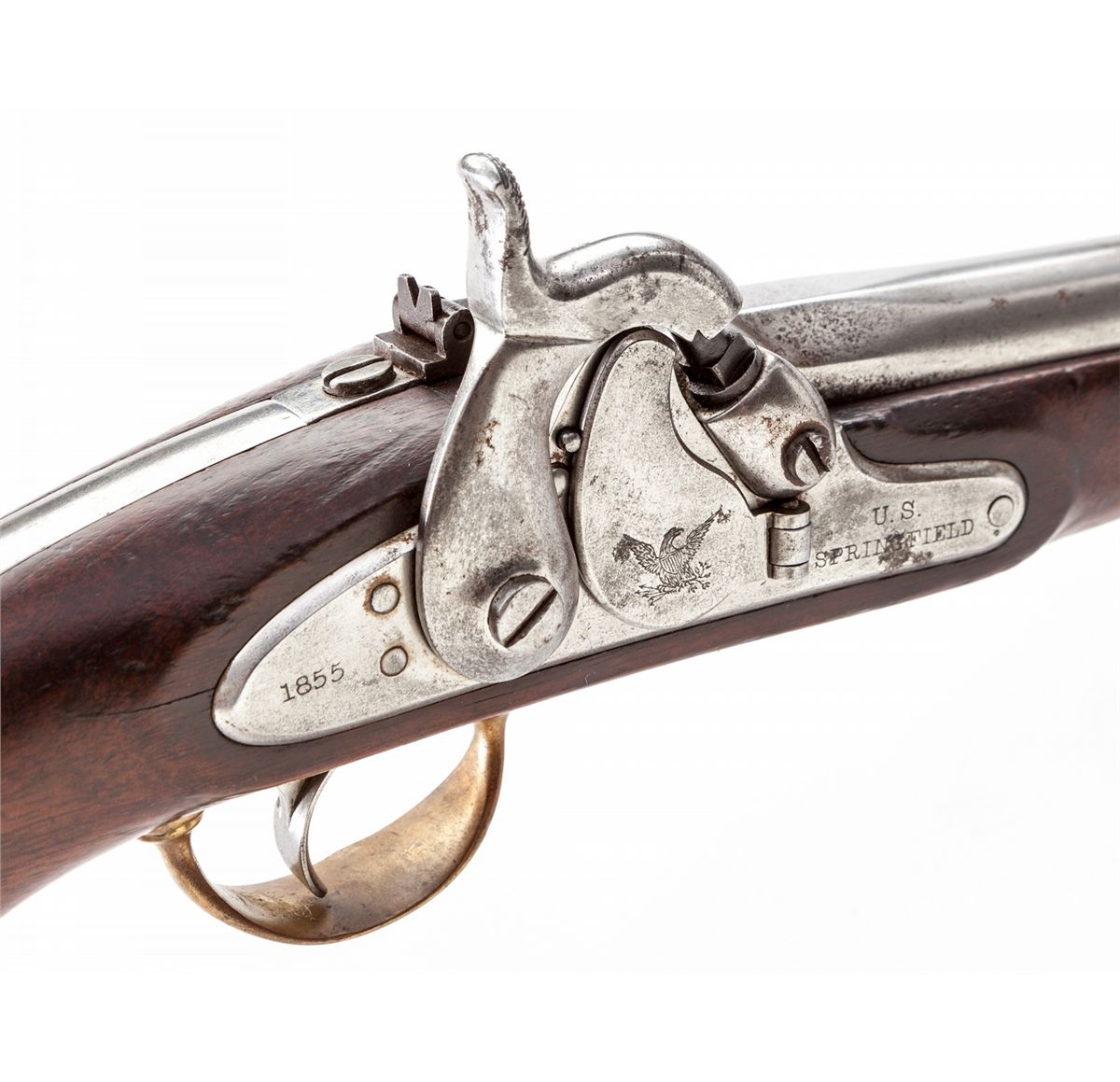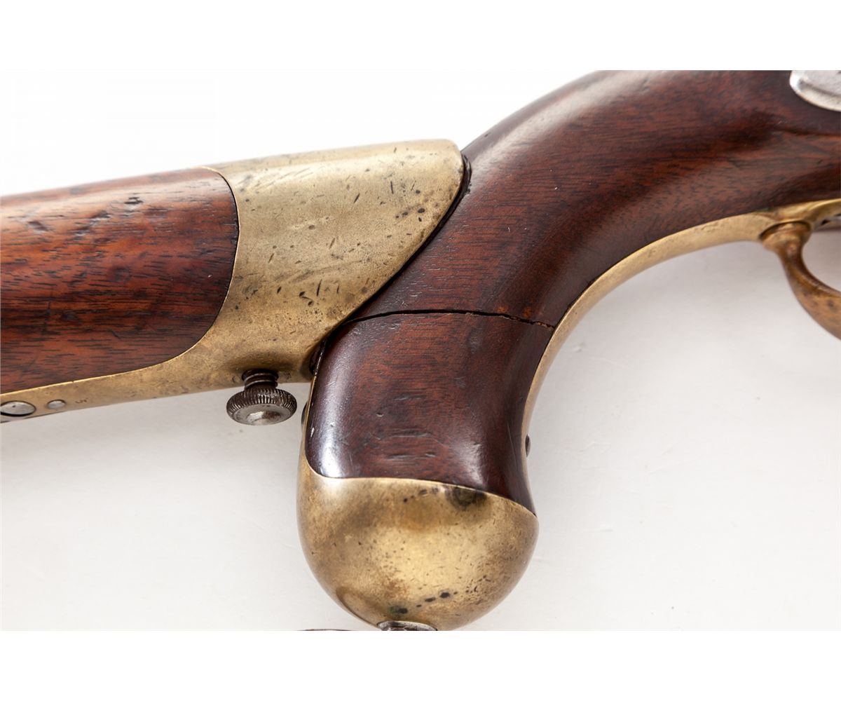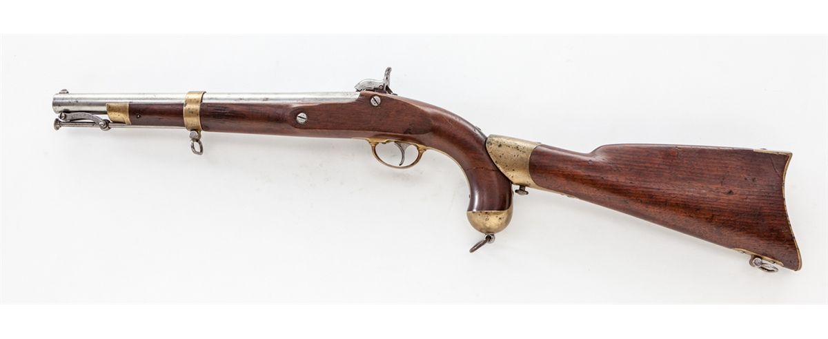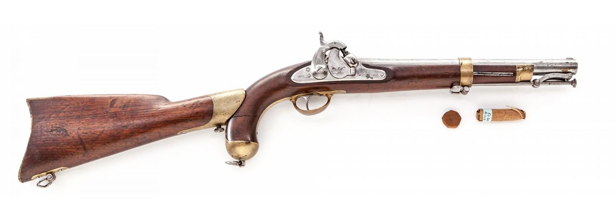Springfield Model 1855 Pistol Carbine, with Stock, Paper Cartridge, and Priming Tape, NVSN, .58 cal., 12'' barrel, finished in the white, walnut stock, brass hardware, and captive ramrod. Mfg'd by the Springfield Armory from 1855-1857. Lock features Maynard self-priming device, three-leaf rear sight, correct three-groove rifling, with approx. 4,020 mfg'd. Union Army's quarterly field reports, dated Dec. 31, 1862, report at least 400 pistol carbines were still in service and found in photographs with both Union and Confederate soldiers during the Civil War. Originally conceived for cavalryman as a pistol for horseback, but with the addition of the stock, troopers could use it for dismounted fighting. Lock is dated 1855 with Federal eagle to Maynard priming device cover, as well as ''U.S. Springfield''; bottom lower tang of stock with small numeral ''5''. This example stock is fitted with spring-loaded push-button type release. Condition is about fine with light carbon toning to bright surfaces and may have possibly been cleaned at one point. Pistol stock with horizontal fracture to right and left sides of pistol grip 1'' above pommel. Stock attachment remains in excellent condition with very light toning and minor discoloration to brass components. An old piece of leather or paper-like material has been added to the inside of cove to prevent marring of pistol. Complete with unopened roll of priming tape and one paper cartridge with pull-string intact. Est.: $3,000-$4,000. (Antique)
