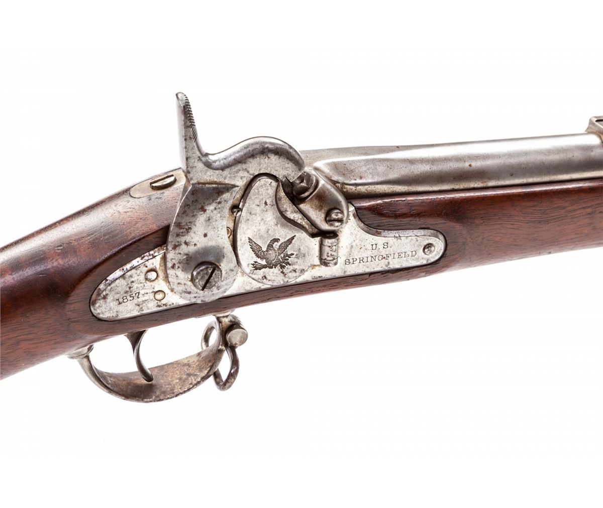 Springfield Model 1855 U.S. Percussion Rifle, .58 cal., 40'' barrel, finished in the white, sideplate and barrel dated 1857, lightly cartouched walnut stock, with long-range rear sight. Condition is excellent, possibly lightly cleaned, with very light patination to barrel and sideplate. Stock with light scuffs, minor scratches, and two faint cartouches to left side. Action remains crisp, bore has toned but should clean. Est.: $1,800-$2,400. (Antique)