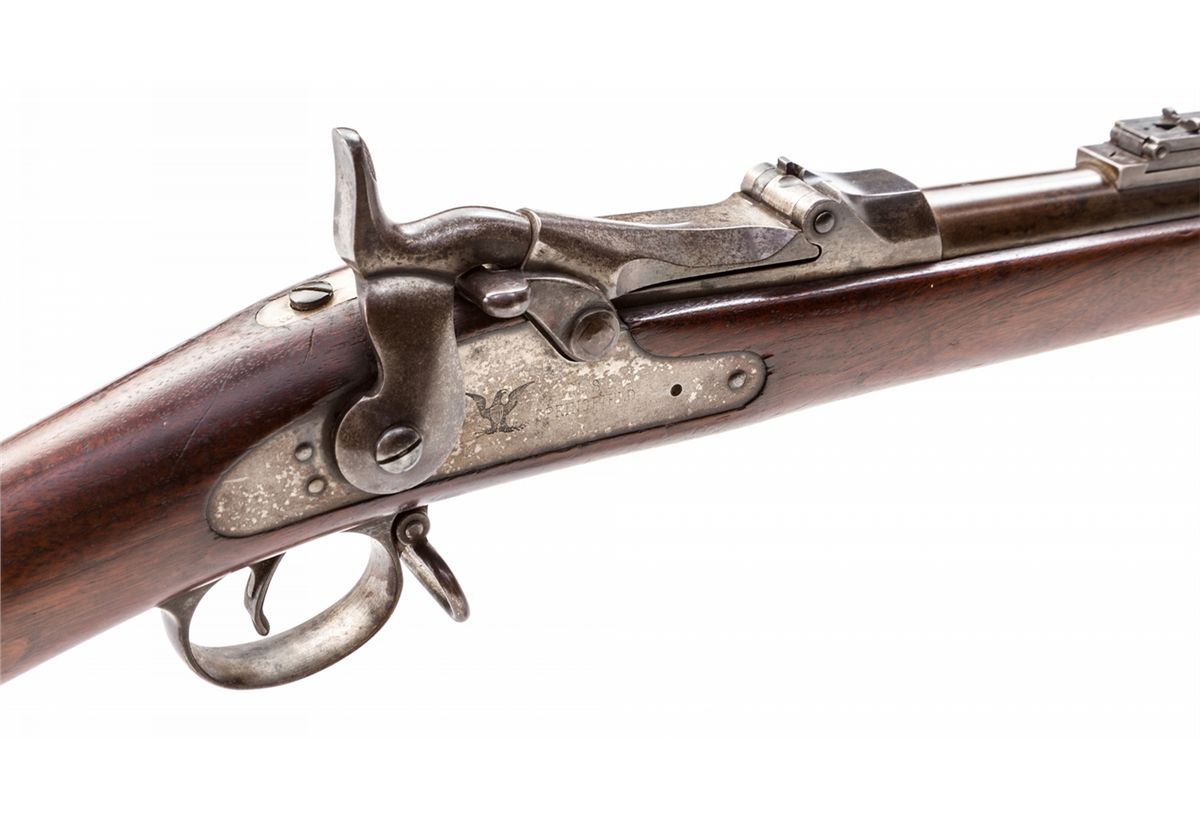 Springfield Model 1888 U.S. Trapdoor Rifle, #524823, .45-70 cal., 32-1/2'' barrel, blue and case hardened finish, 1891 cartouched walnut stock, with ramrod bayonet. Considered somewhat scarce with only 65,000 produced. Condition is very good. Barrel with approx. 60% mottled blue. Sideplate and 1884 dated breechblock have toned silvery gray. Stock with light scuffs, scratches, minor dings, light chips just forward of triggerguard, and clear legible cartouches. Action is good, bore is fine. Est.: $750-$1,000. (Antique)