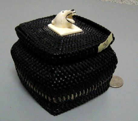 Square shaped baleen basket with polar bear head finial by Seymour T- 3-3/4" tall