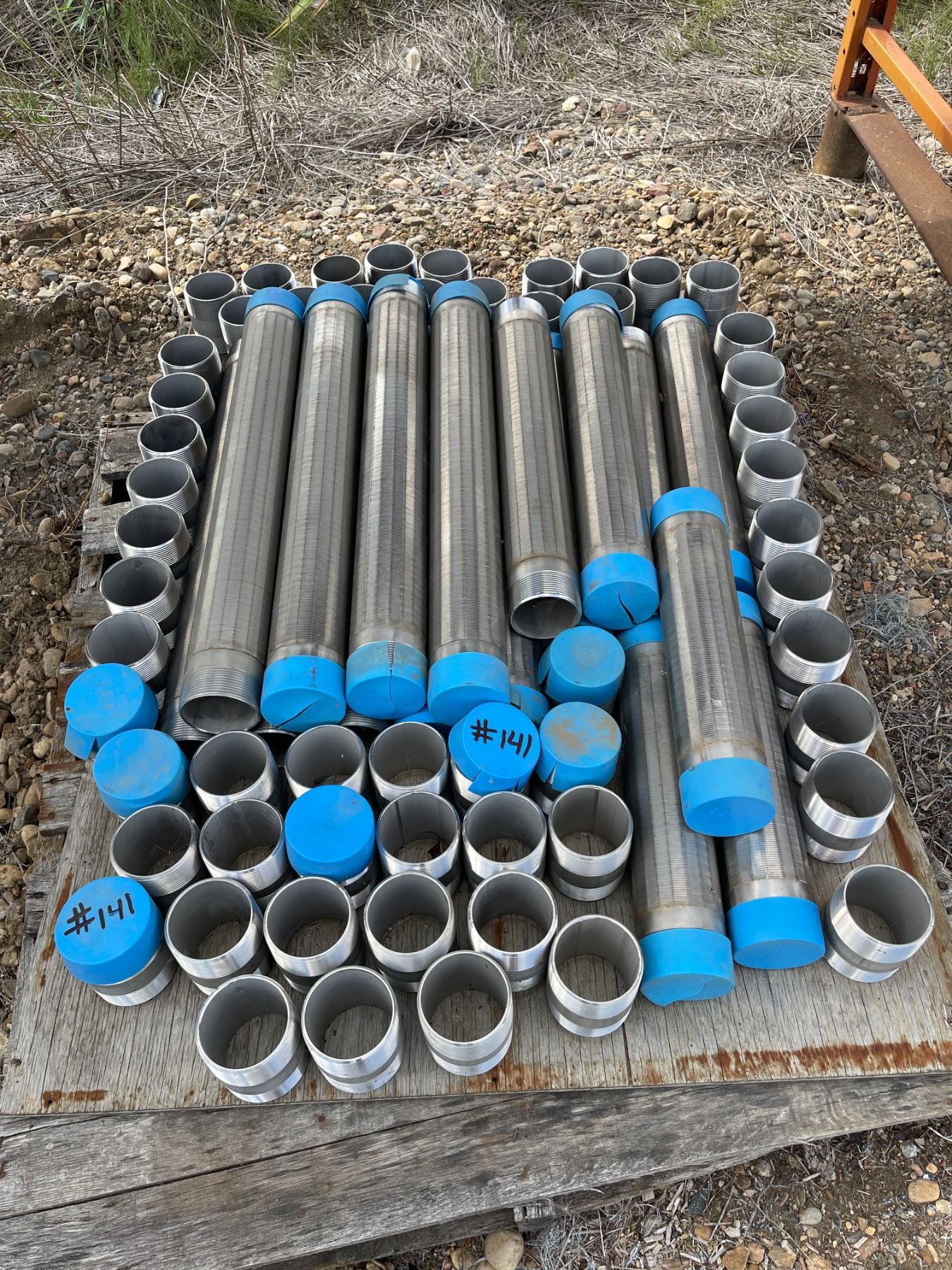 Stainless Steel 316 and 316L threaded 3” pipe nipples (approx 56 units), 3" Stainless steel screens (9-29", 6-22.5", 3-16.5" lengths)