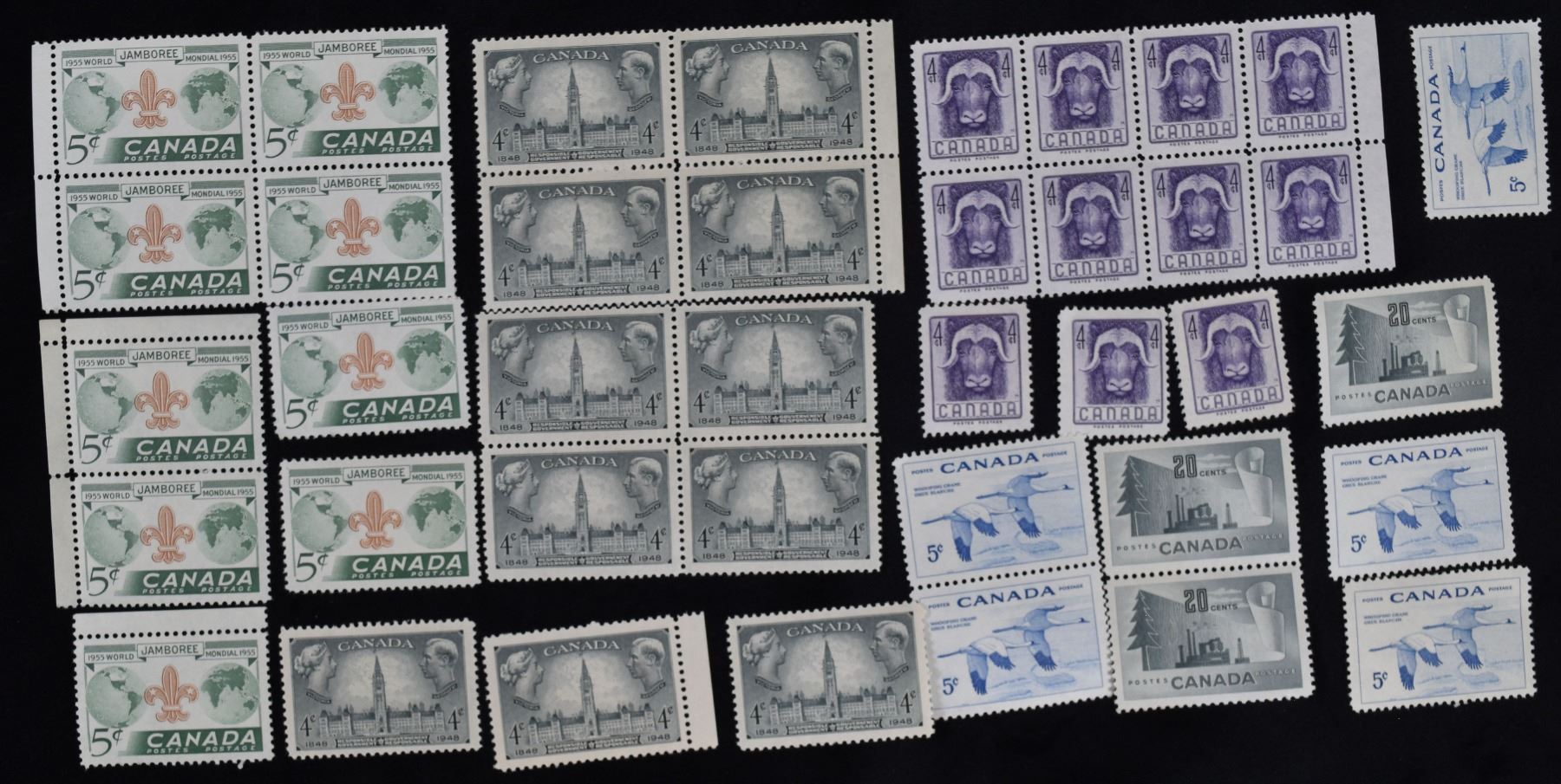 Lot of 39 Canada Stamps; 11 x 4c Responsible Government 1848 - 1948, 9 x 5c Boy Scouts, 11 x 4c Musk Ox 1955, 3 x 20c Forestry, 5 x 5c Whooping Crane 1955; Mint Never Hinged