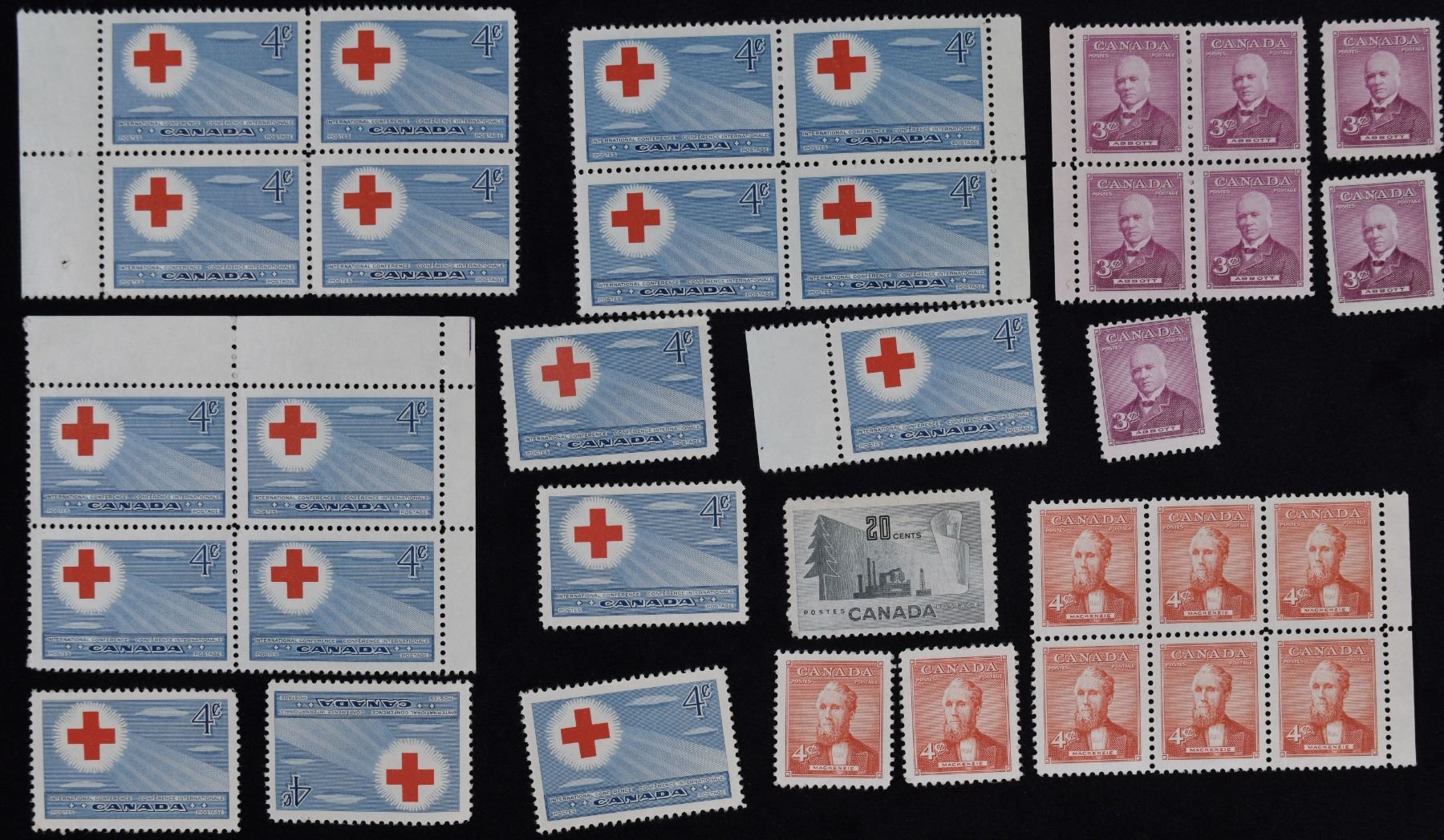 Lot of 34 Canada Stamps; 7 x 3c Sir John Abbott, 8 x 4c Alexander Mackenzie, 18 x 4c Canada Red Cross, 1 x 20c Canada Paper Mill; Mint Never Hinged