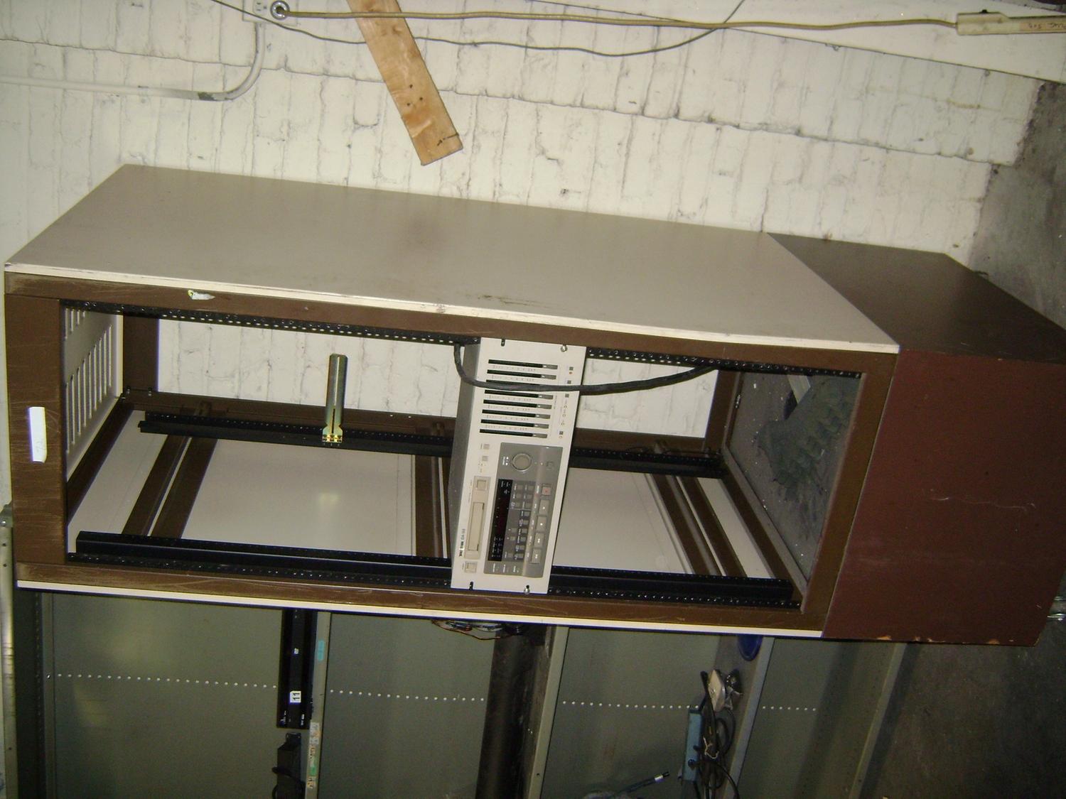 Stantron Equipment Rack. Tan / Brown. 80" high, 36" deep. On casters. With shop power strip at rear.