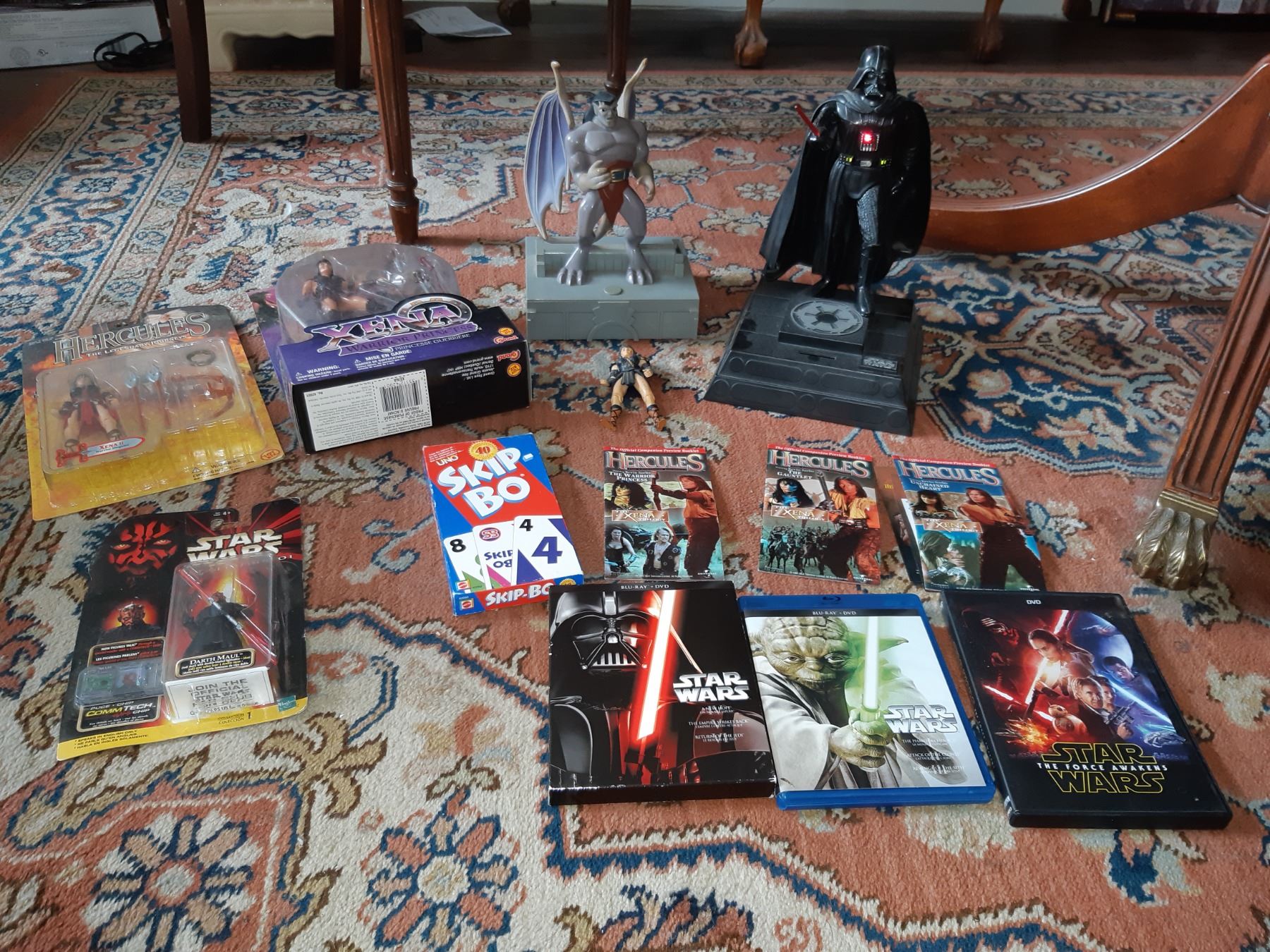 2 Xena figurines in box, gargoyle talking figurine, Darth Maul figurine in box, Darth Vader talking figurine, blue ray movies, pickup 9 am