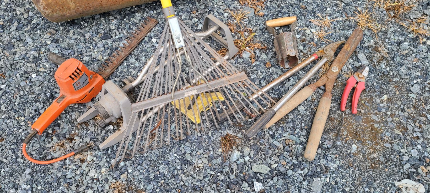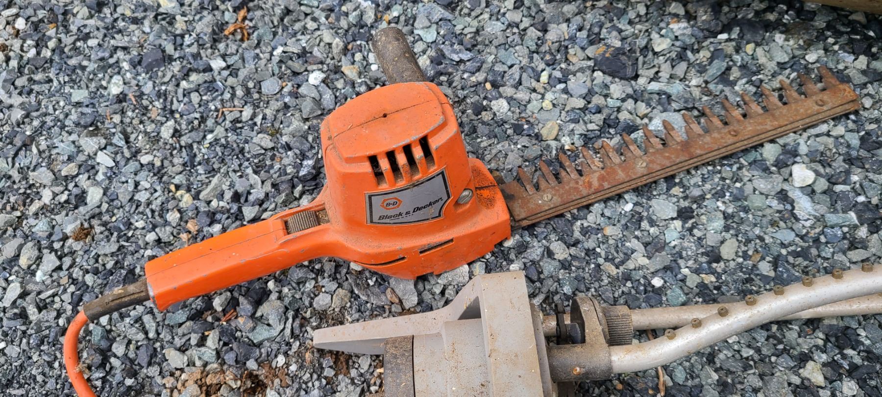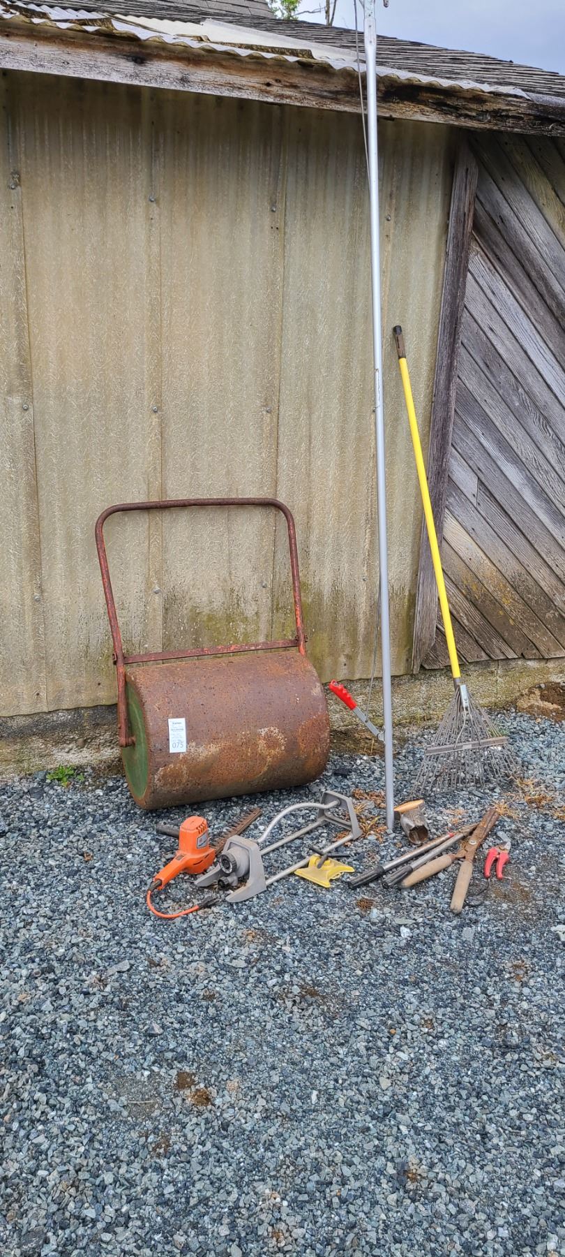 Steel roller needs plug, branch lopper and B&D hedger, untested and various garden tools. Pickup at 11 am