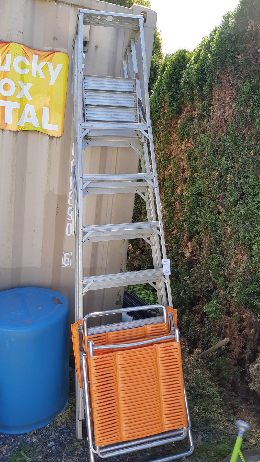 6' step ladder and orange patio lounger. Pickup at 10 am