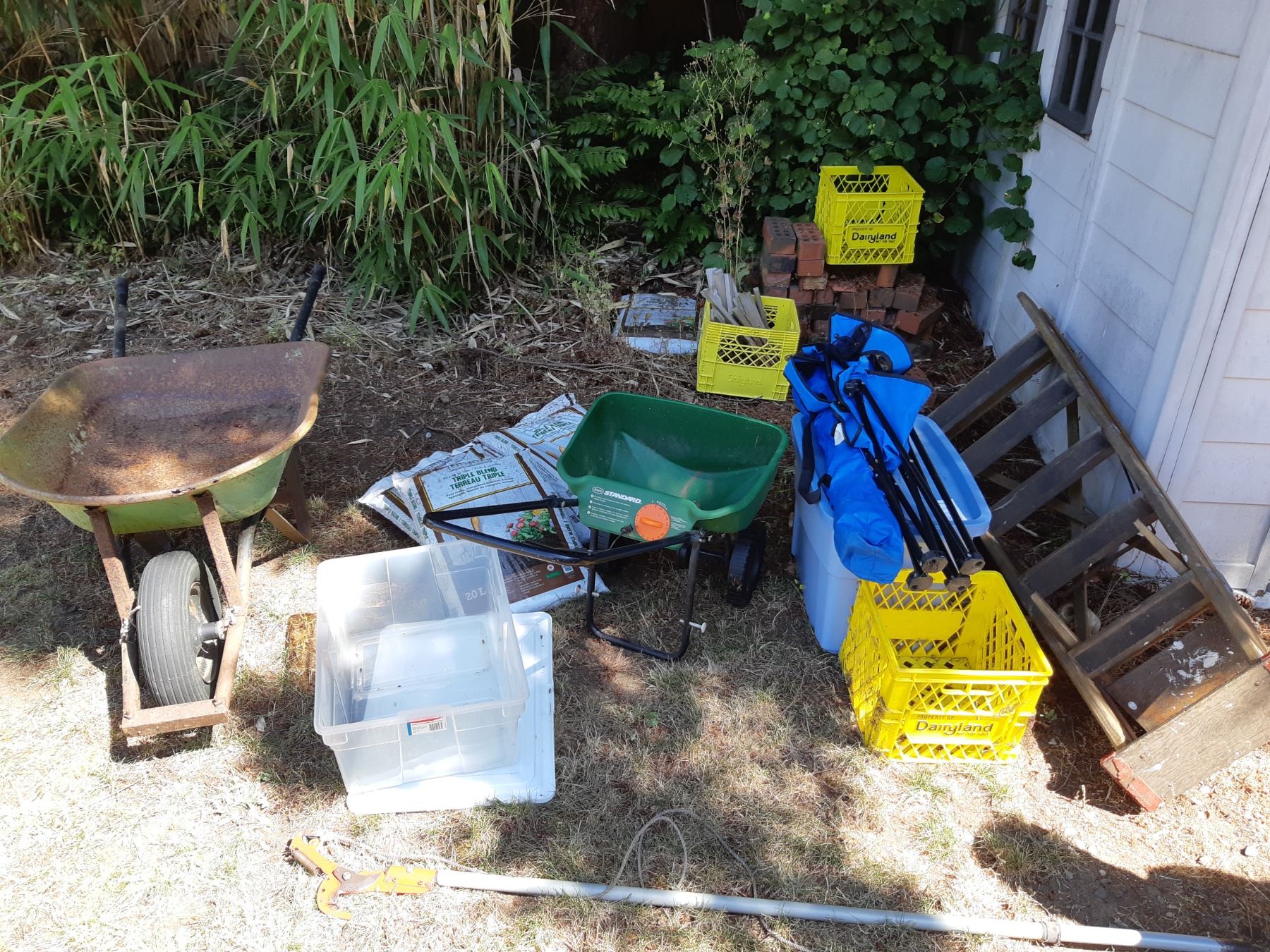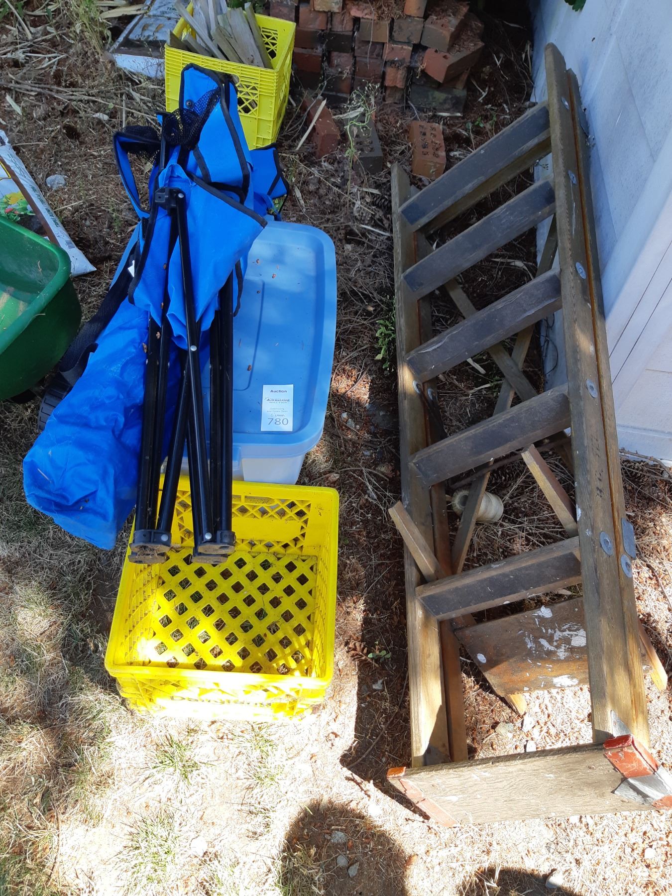 5' wooden step ladder, camping chairs, wheelbarrow, potting soil, outdoor Christmas lights and more. Pickup at 11 am