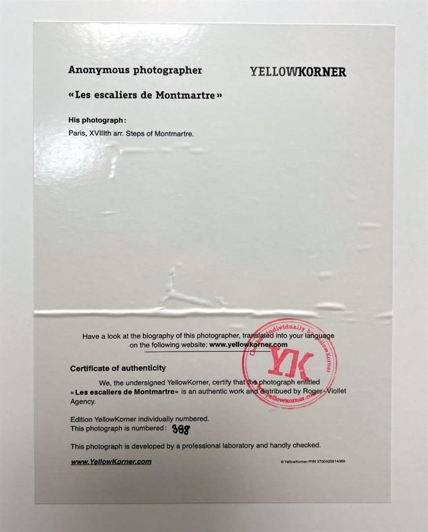 Steps of Montmartre Les Escaliers de Montmatre YellowKorner Certified Photograph. Certificate of Authenticity from YellowKorner affixed to the back. Matted Dimensions 16"x20". Protected with Clear Mylar Sleeve.