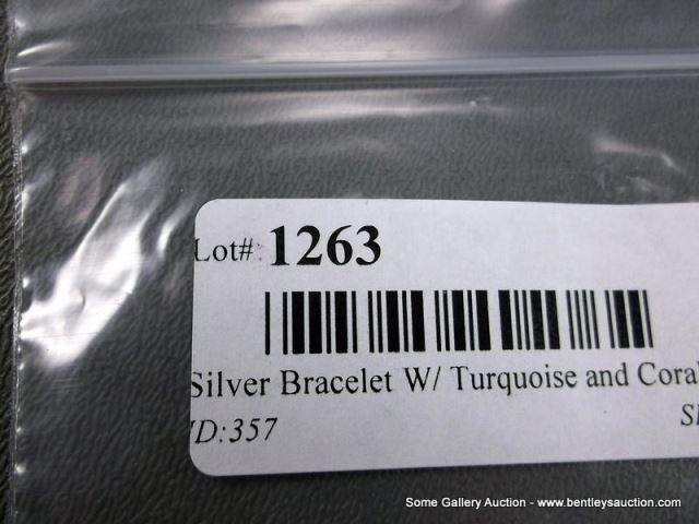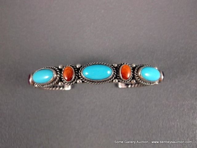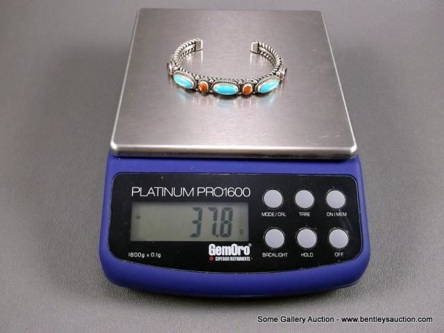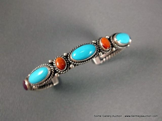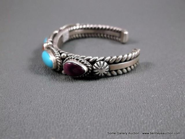 Sterling Silver Bracelet w/ Turquoise, Orange and Purple Stones-Marked D. Cadman Weight: 37.8 Grams