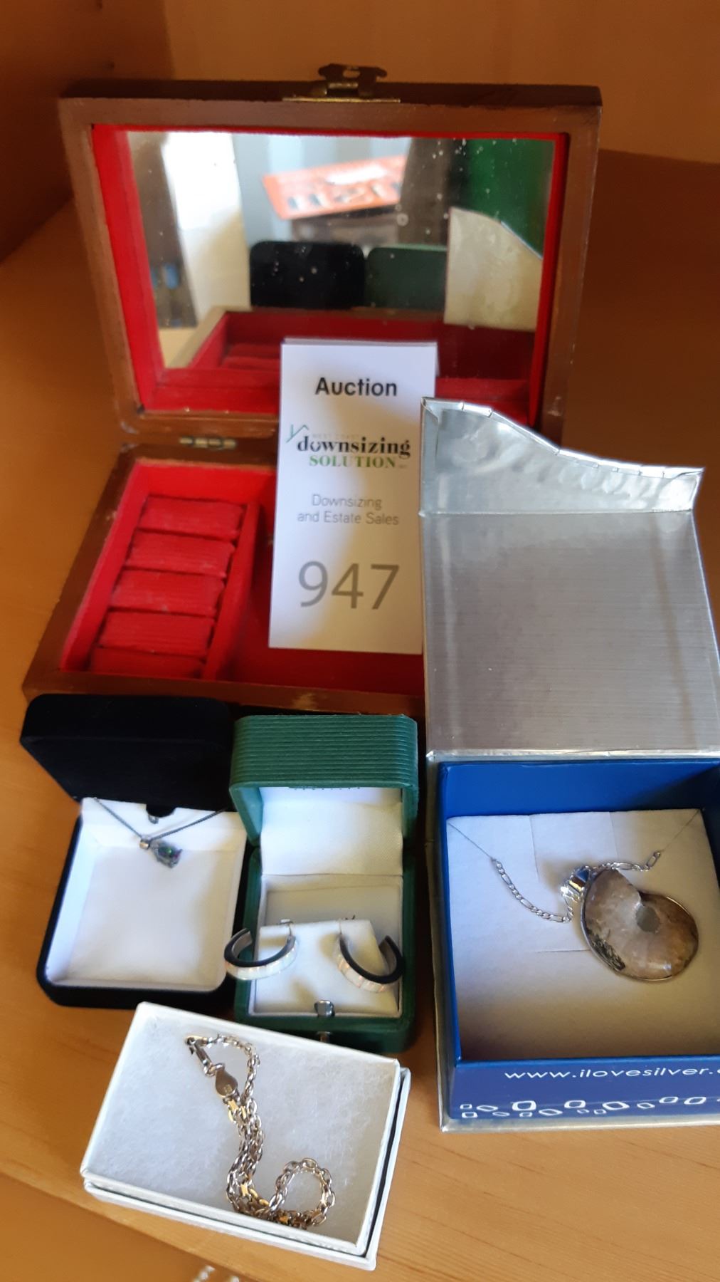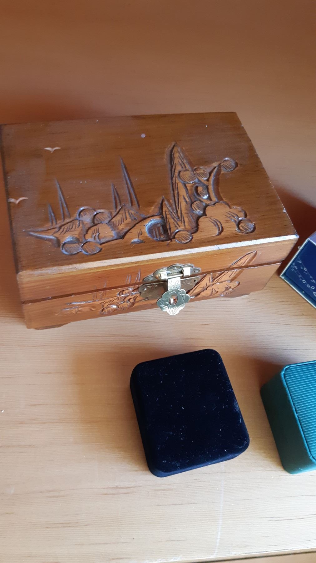 1 metal necklace and 3 x silver necklaces. With wood jewelry box. Pickup at 9 am