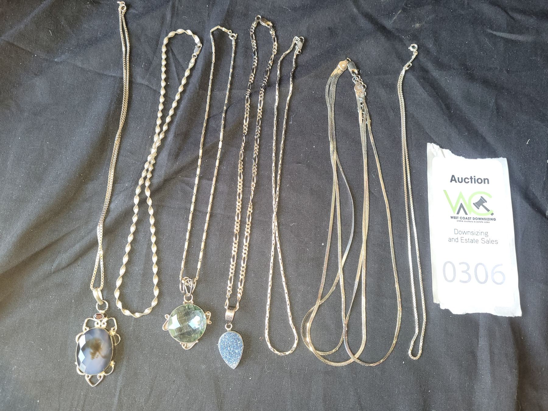 7 Sterling Silver Chains, pendents are not sterling. Largest chain is 18". SC2 Pickup at 9 am