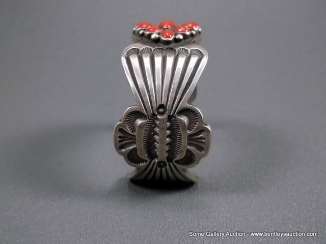 Sterling Silver Stamped Cuff Bracelet w/ Coral Blossom Stones-Marked ERB Weight: 101.8 Grams Retail: