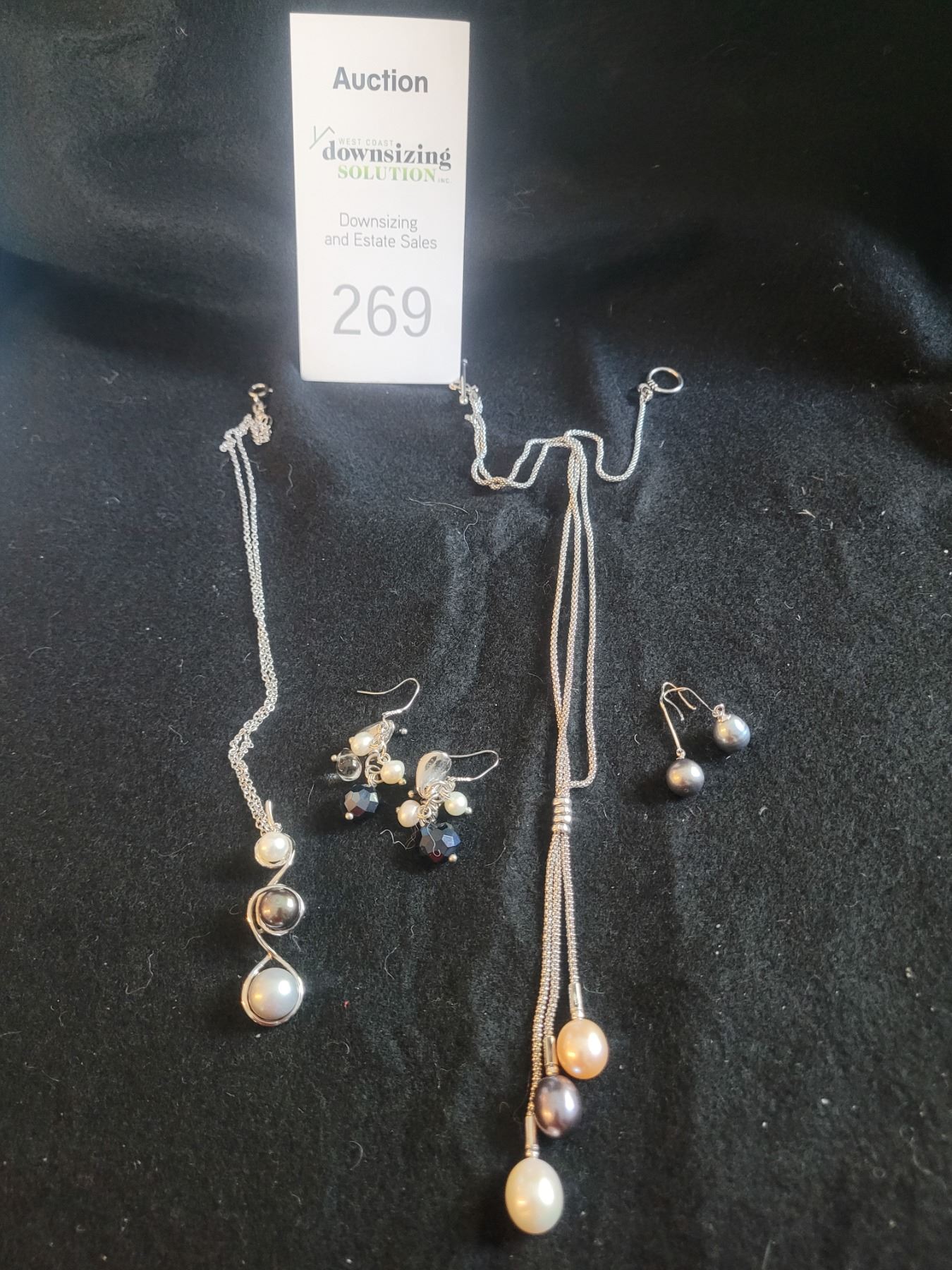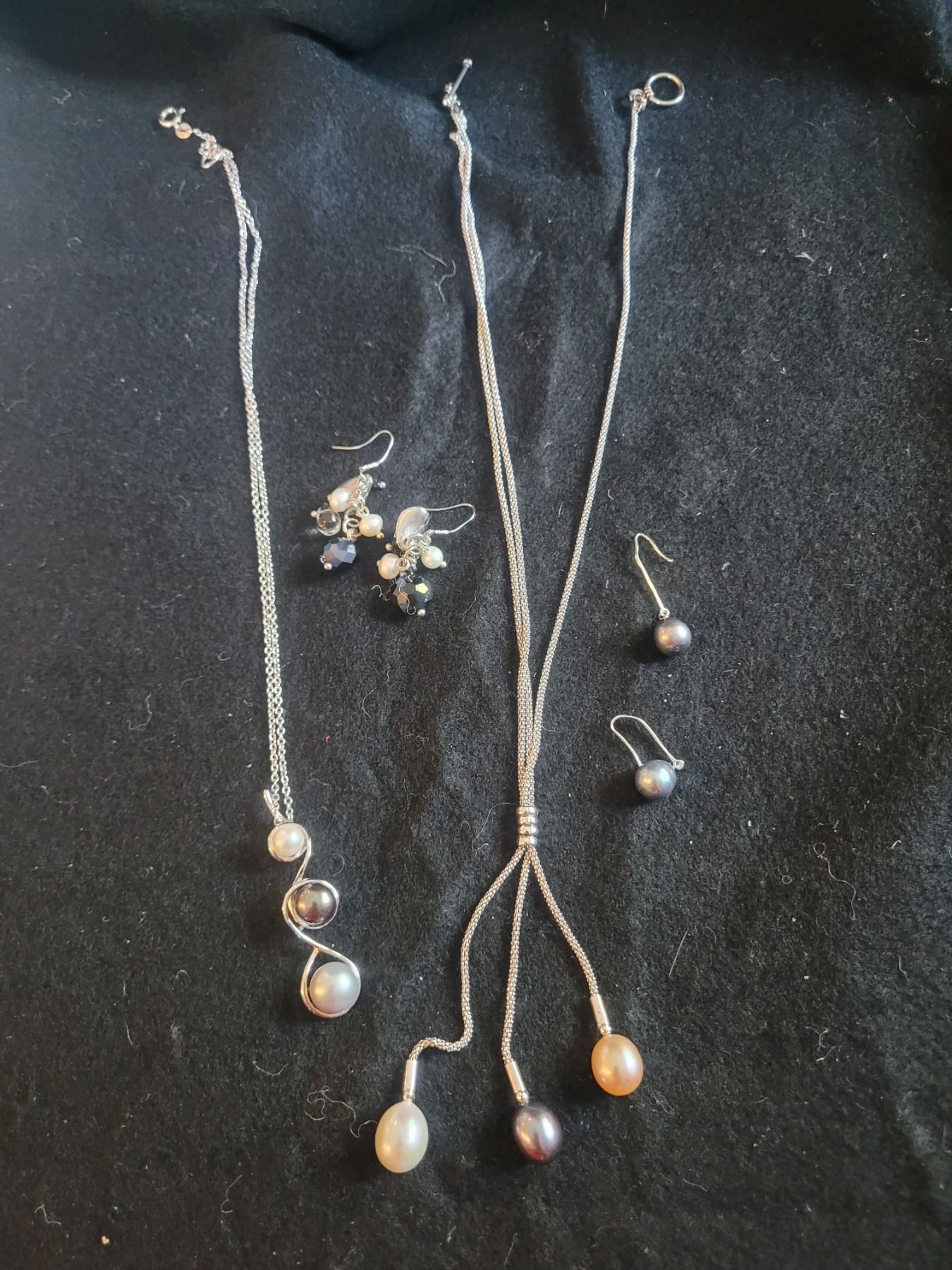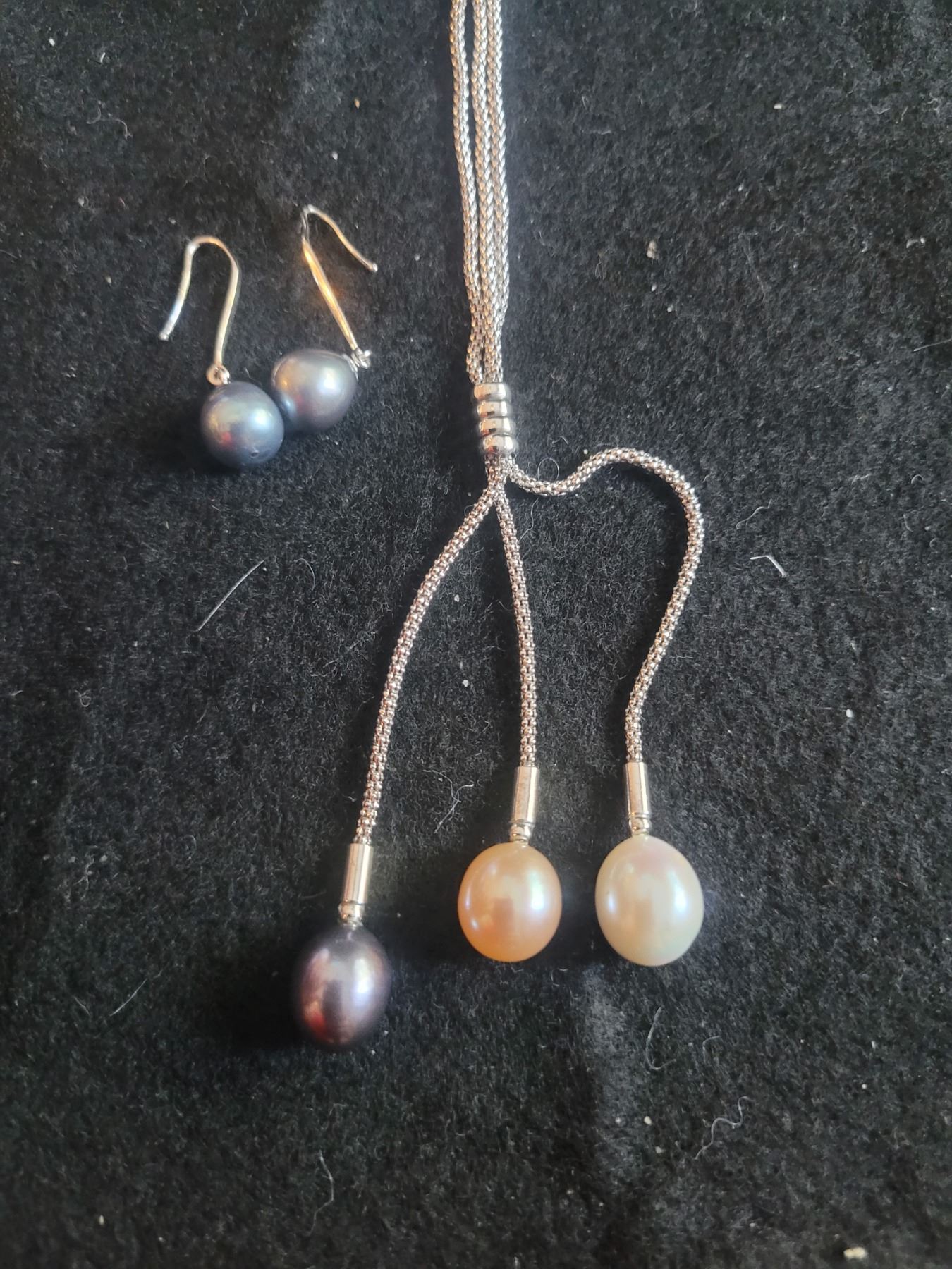 18" Sterling chain with 3 drop pearls. 18" Sterling necklace with Sterling S curve 3 pearls pendant. Puckup at 9 am