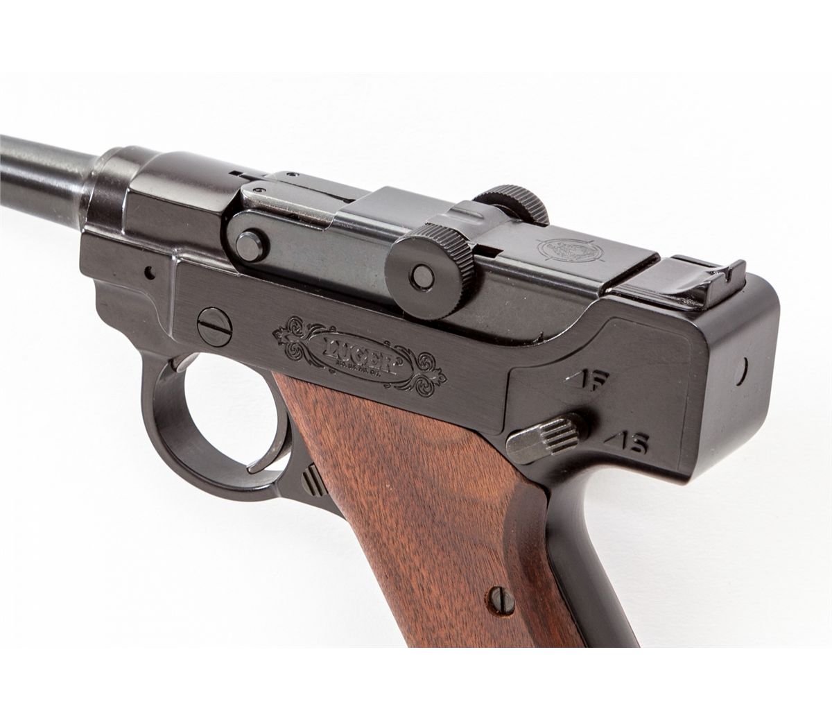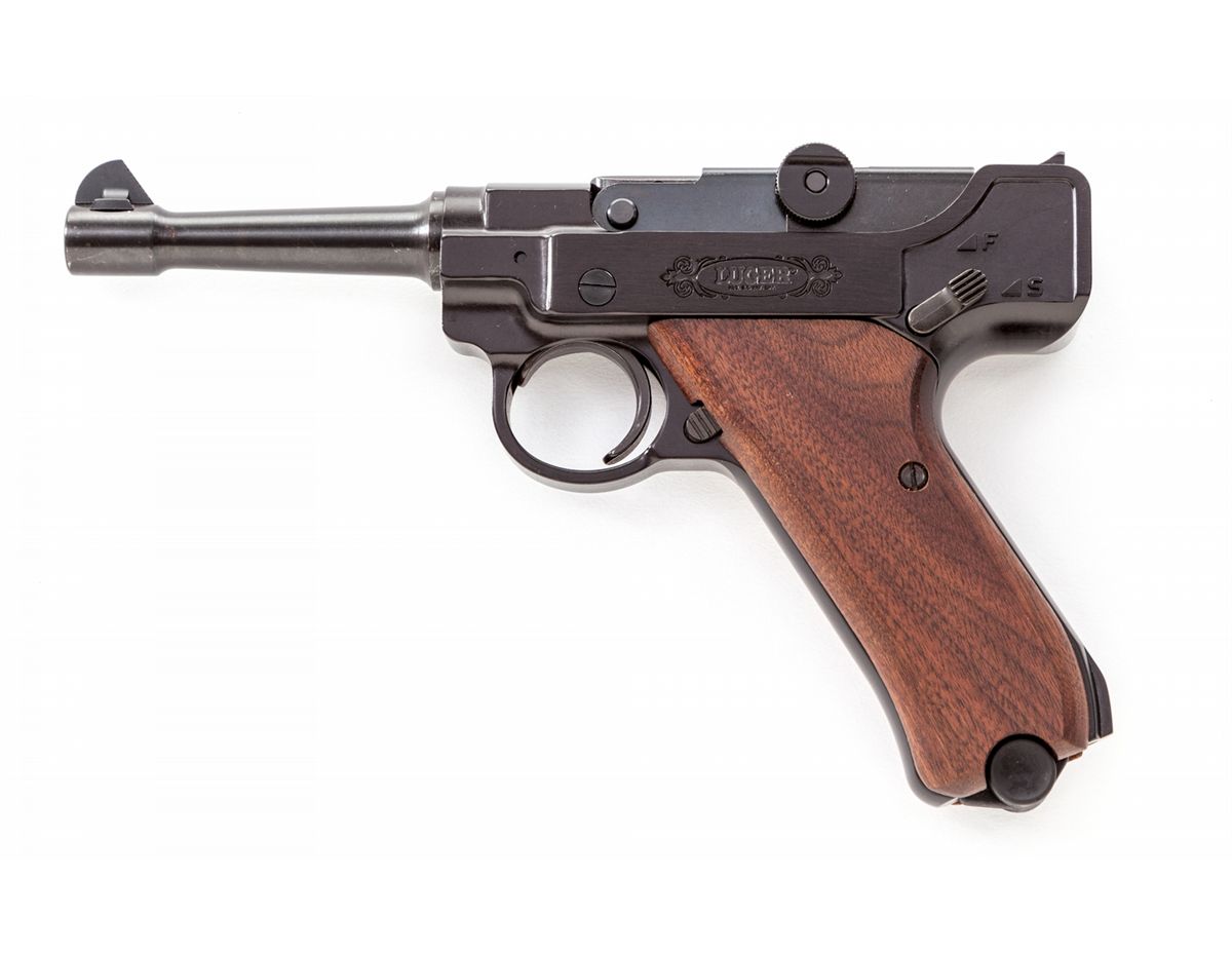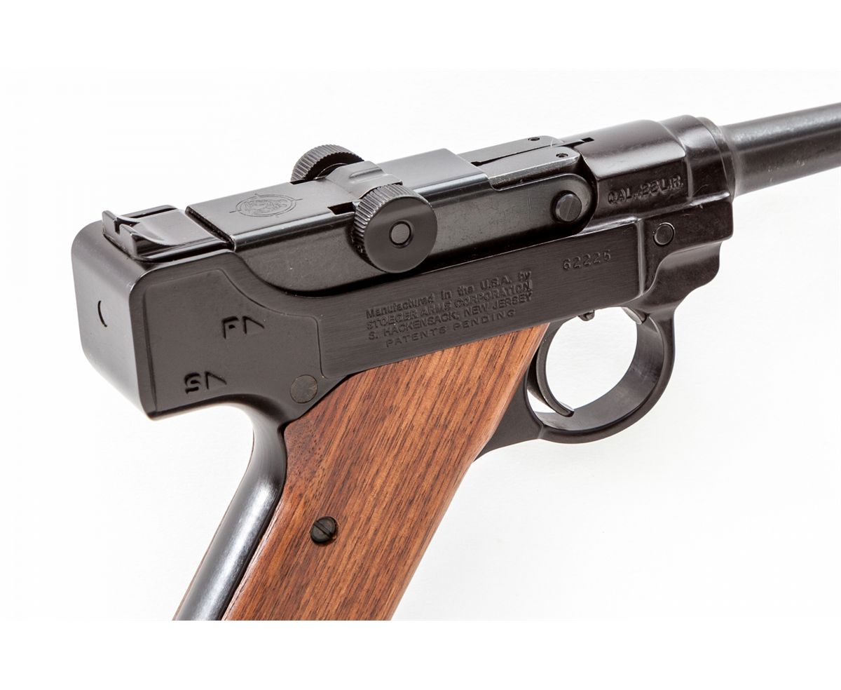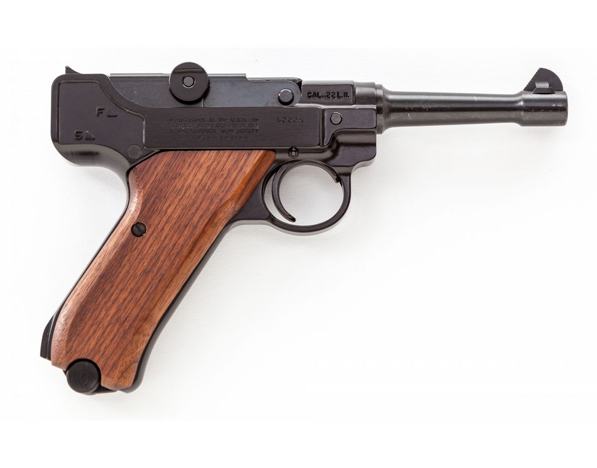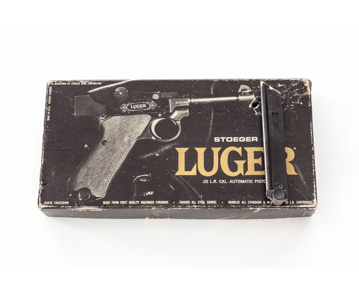 Stoeger Luger Semi-Automatic Pistol, #62225, .22 LR cal., 4-1/2'' barrel, matte blue finish, smooth panel walnut grips, with two magazines and all associated paperwork, in its original box. Condition is excellent showing light marks from handling. Box with minor tatters and small puncture. Est.: $400-$600. (Modern)