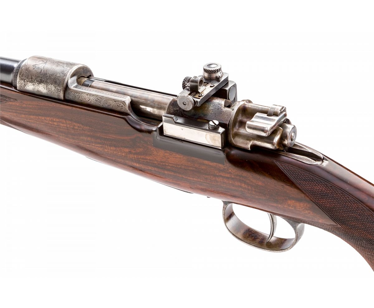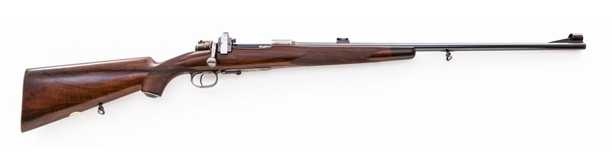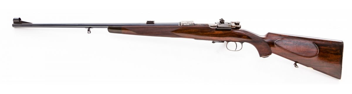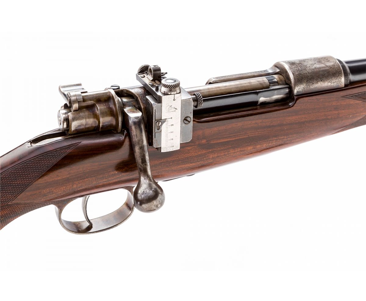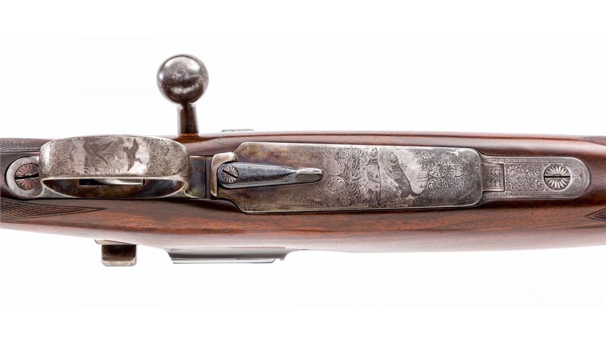Stunning Pre-War Charles Daly Bolt Action Sporting Rifle, #26625, .30-06 cal., 25'' blue barrel, banknote and game scene engraved case hardened receiver, bolt floorplate, triggerguard, pistol-grip cap and buttplate. Based on a German mfg'd receiver and proofed with standard ''BUG'' proofmark. Receiver is English banknote engraved with bull moose to top of receiver ring; similarly adorned floorplate shows hunting dogs on point. Fancy grain German nutwood type walnut stock with cheekpiece, pistol-grip, and ebony forend cap. Two-leaf Express type rear sight, platinum bead hooded ramp front sight, and Lyman No. 48 receiver sight. Top of barrel marked ''Charles Daly Roechling Electro Steel''. Condition is excellent remaining in near new, with one professional repair to toe of stock. Est.: $3,000-$5,000. (C&R) (Ernest A. Bryant III estate)