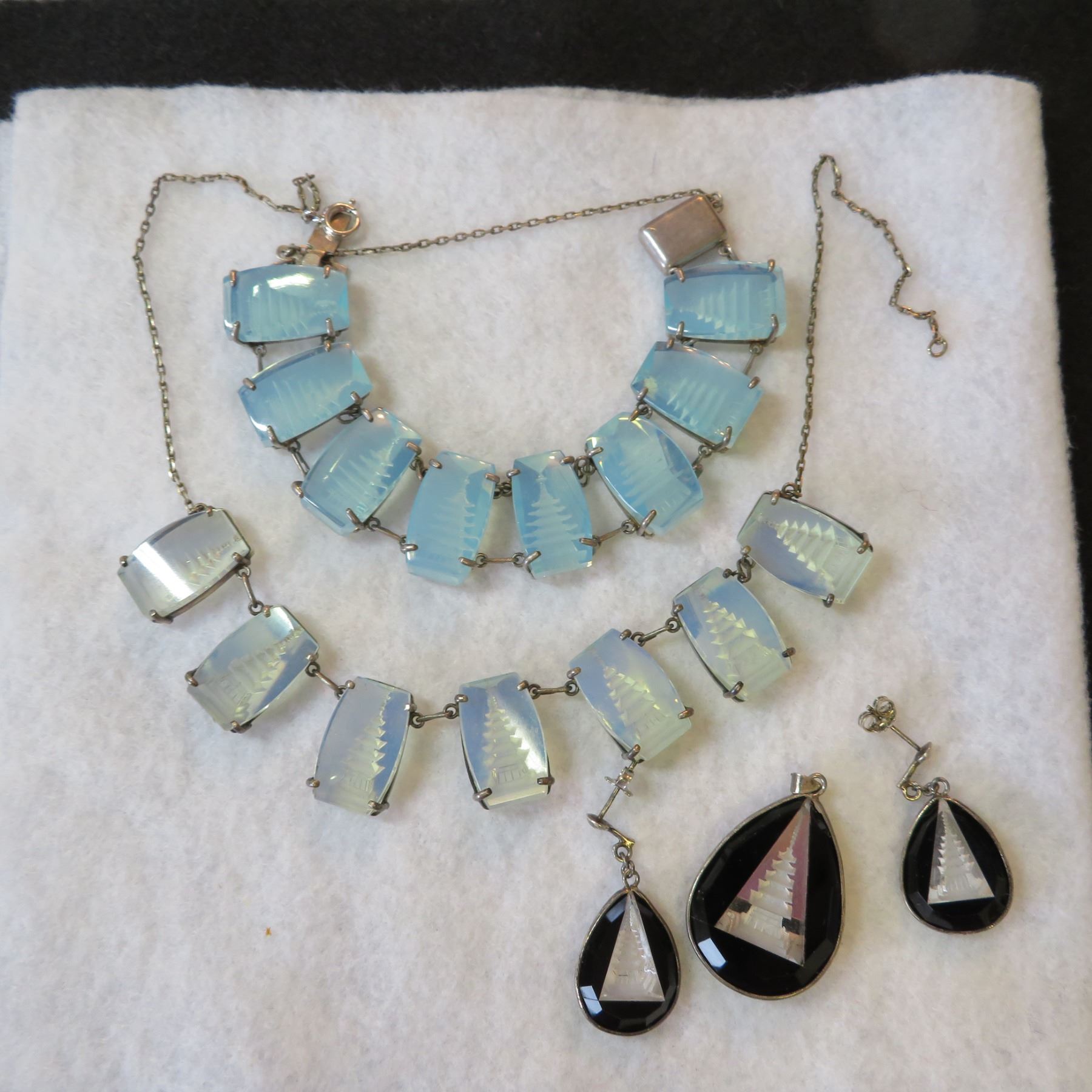 Stunning vintage 925 Silver & Japanese Opalescent Carved Pagoda Art Glass in two styles. Matching bracelet & necklace with blue glass and pendant & pierced earrings with clear/black glass.