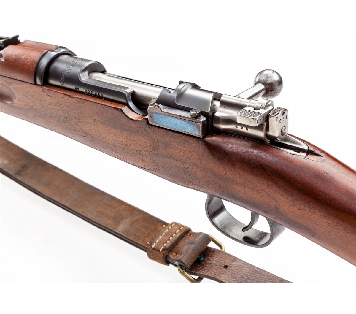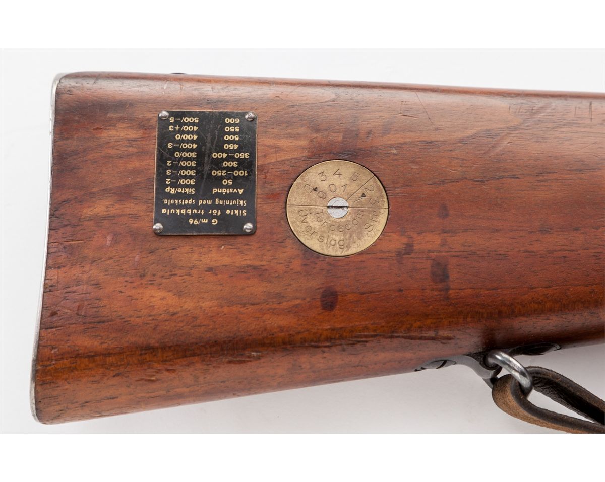 Swedish Model 1896 Bolt Action Rifle, by Carl Gustafs (1913), #320652, 6.5x55 cal., 29'' barrel, blue finish, bright bolt, full-length European walnut stock, with sling. Condition is excellent retaining approx. 96% original blue with some thinning to bolt release. All visible matching serial numbers. Stock with light bruises and scuffs. Action remains crisp, bore is bright. Est.: $400-$600. (C&R)