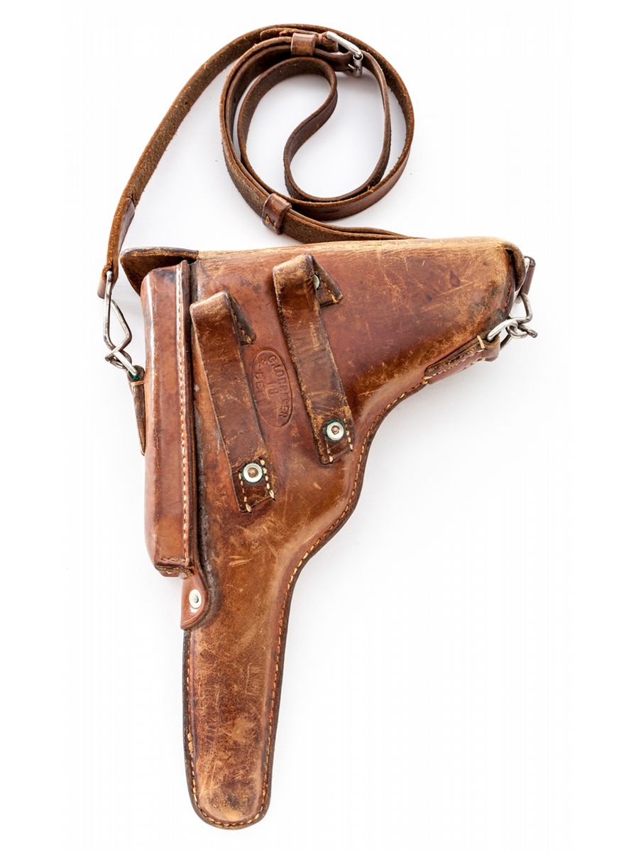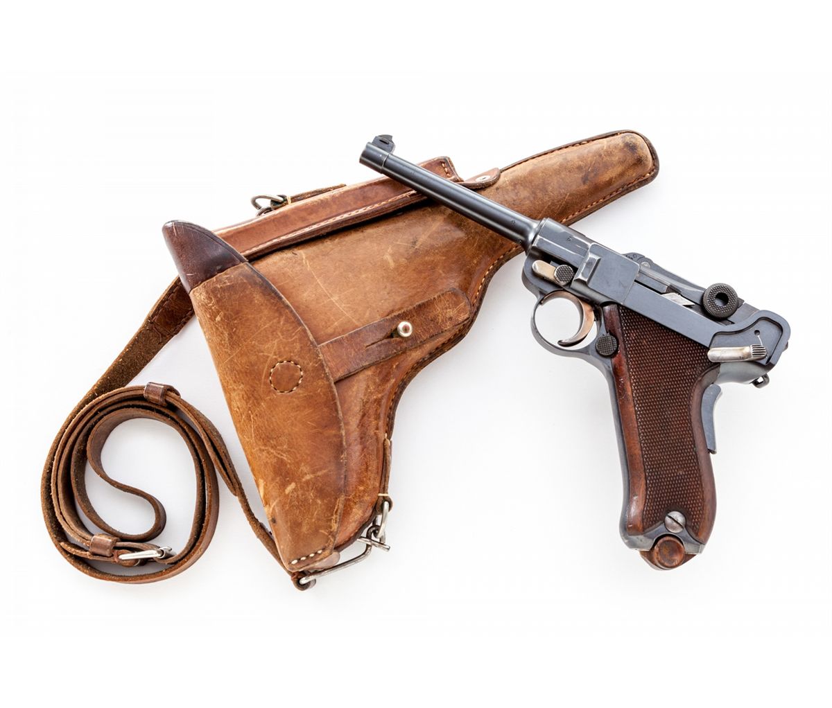 Swiss Model 06/24 Luger Semi-Automatic Pistol, #24199, .30 Luger cal., 4-3/4'' barrel, blue finish, straw small parts, checkered walnut with smooth bordered grips, with one correct unmarked wood base nickel-plated magazine. In correct type Swiss leather holster. Considered uncommon with blank chamber area, toggle marked ''Waffenfabrik/Bern'', lower portion of safety area polished bright. Condition is very good retaining approx. 97% Swiss blue, with thinning to high edge of sideplate and at muzzle and straw colored trigger. Grips remain crisp. Grip screws have toned gray. Action is good, bore is bright. Holster remains in very good condition with some oil darkening. Est.: $1,200-$1,800. (C&R)