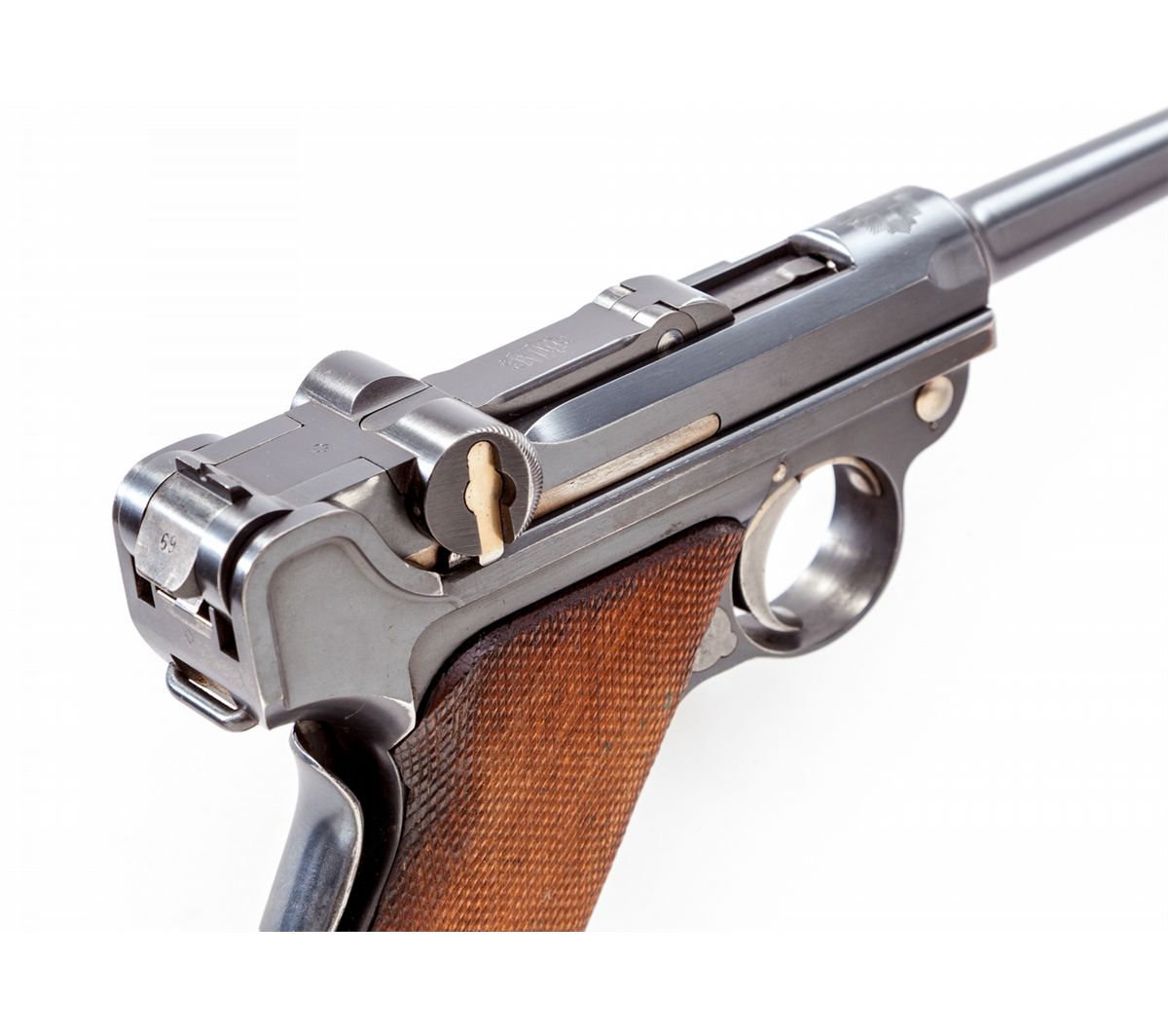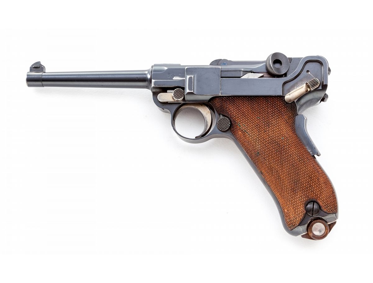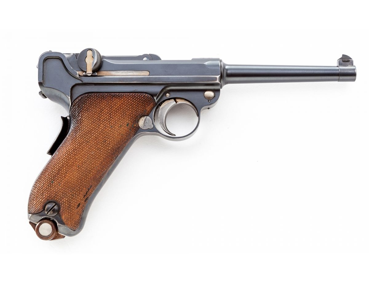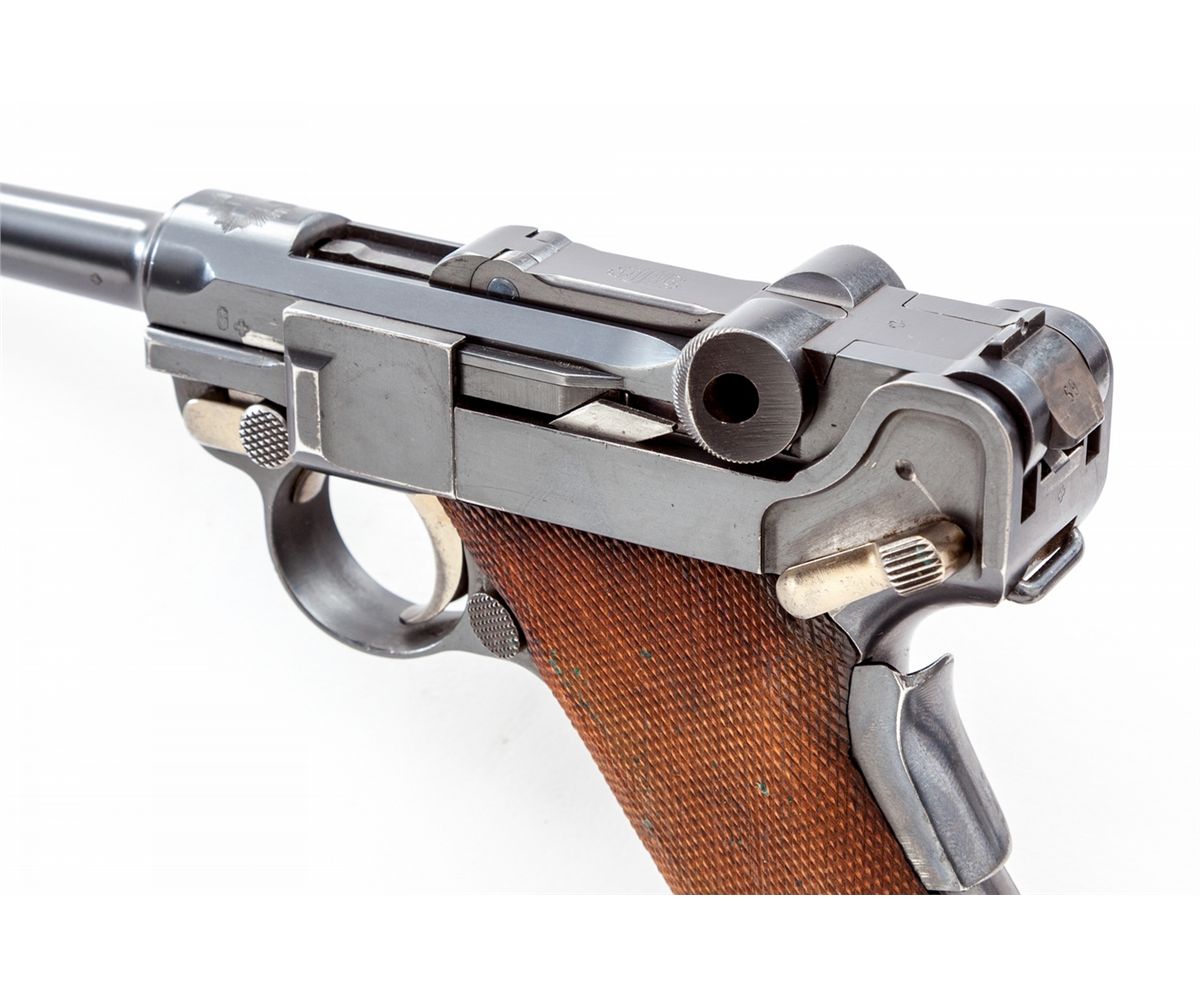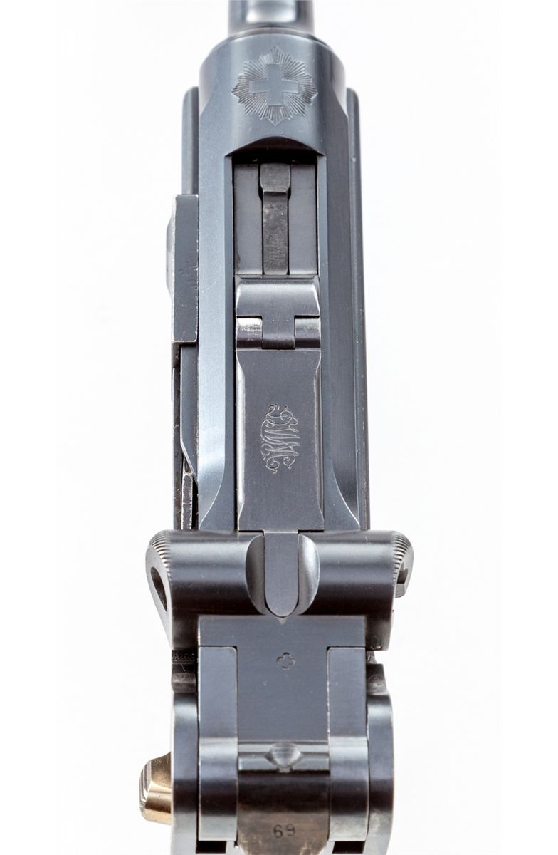Swiss Model 1900 Military Luger Semi-Automatic Pistol, #3069, .30 Luger cal., 4-3/4'' barrel, blue finish, straw small parts, factory checkered walnut grips, with one unmarked Swiss magazine with wood base and metal insert. Swiss cross in starburst to top of chamber, and DWM marked toggle. Considered somewhat rare with only approx. 3000 mfg'd. Condition is fine to near excellent as partially restored. Swiss rust blue shows minor thinning to high edges of sideplate and near grip safety. Straw finish to thumb safety has been redone at a later date. Grips with darkening at metal contact points and minor evidence of re-tracing. Action is good, bore is bright. Est.: $1,800-$2,400. (C&R)