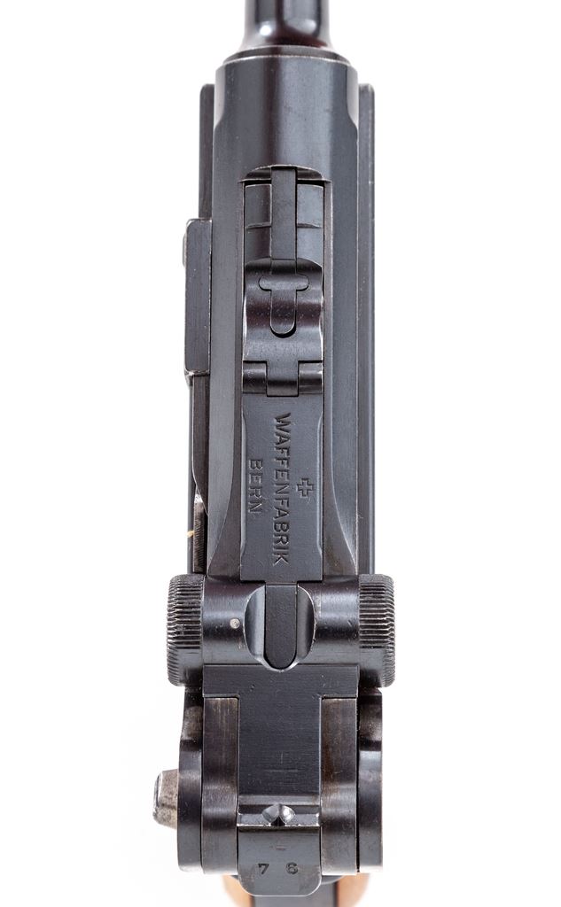 Swiss Model 1906-24 Luger, by Waffenfabrik Bern., #17076, .30 Luger cal., 4.75'' barrel, blue finish with straw small parts, smooth bordered matching numbered checkered walnut grips, with one early nickel-plated magazine with walnut base, numbered ''501''. Chamber area blank, toggle marked Waffenfabrik/Bern., lower area of thumb safety polished bright, grip safety present on this model. Left forward portion of frame stamped ''P 59'' and Muhlemann inspector markings. No visible importation marks. Condition is excellent with approx. 96% blue and thinning at highpoints, more pronounced on grip safety. All visible matching numbers except magazine, which is a tin-plated wraparound wood based type numbered 501. Grips and action are crisp, bore is excellent. Est.: $1,500-$2,000. (C&R/PPT)