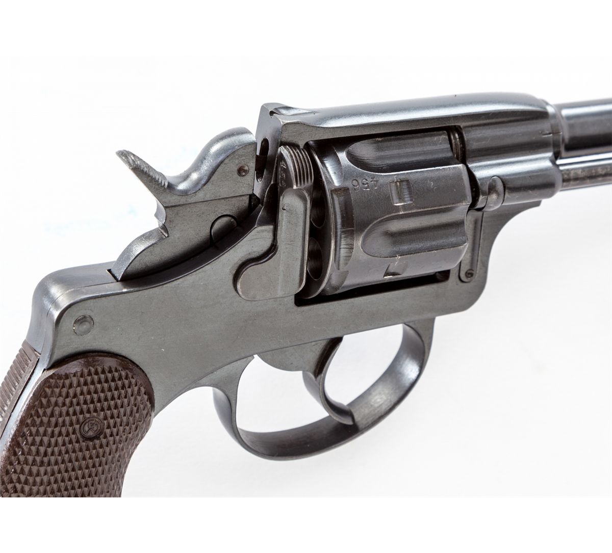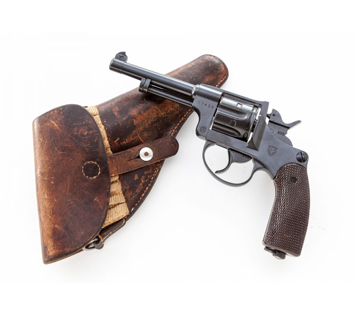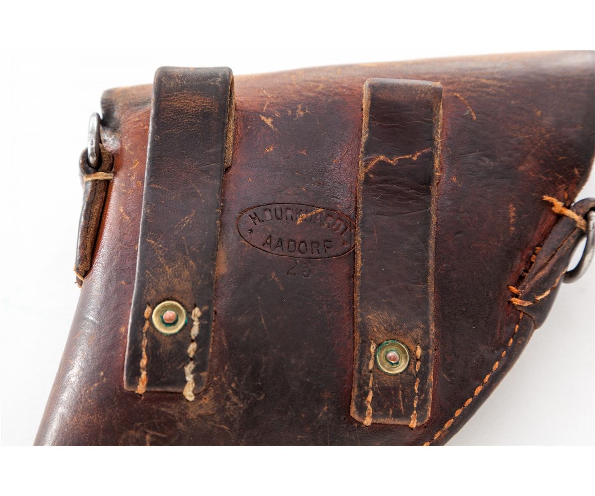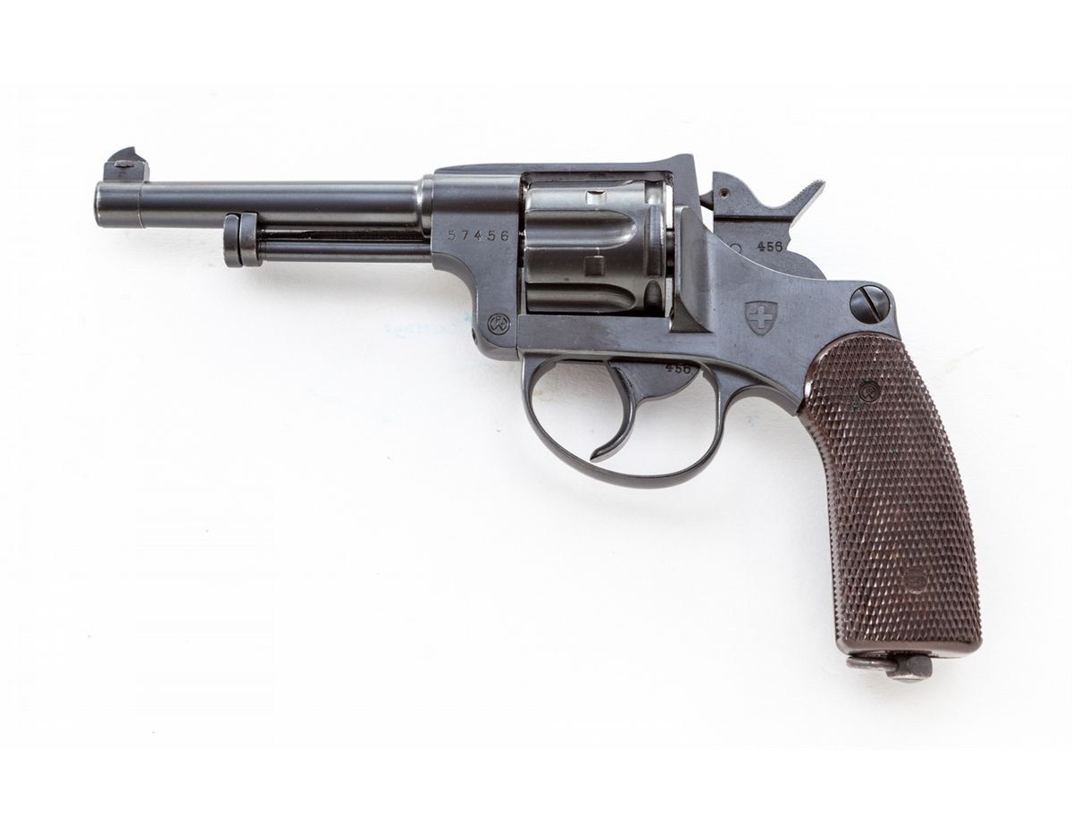 Swiss Model 1929 Double Action Revolver, with holster, #57456, 7.5x23R cal., 4-1/2'' barrel, blue finish, brown checkered plastic grips, with lanyard loop in butt. Condition is excellent with only light wear at muzzle and very minor wear at edges. Grips are crisp, action is tight, bore is bright. Brown leather holster shows scuffs commensurate with age. Est.: $750-$1,000. (C&R)