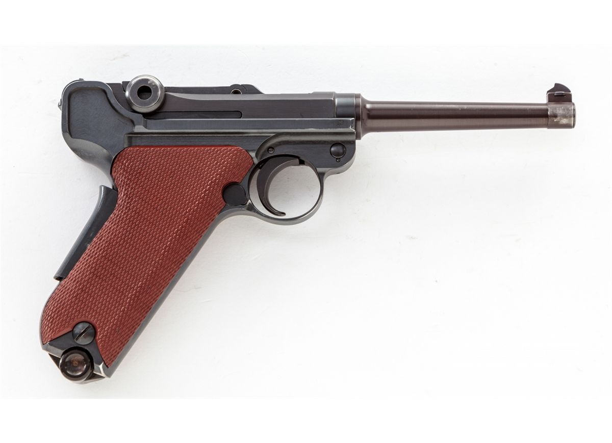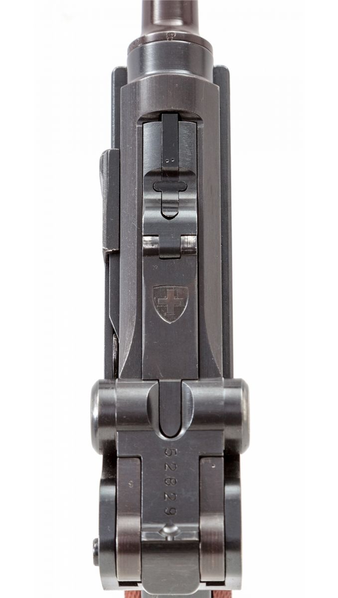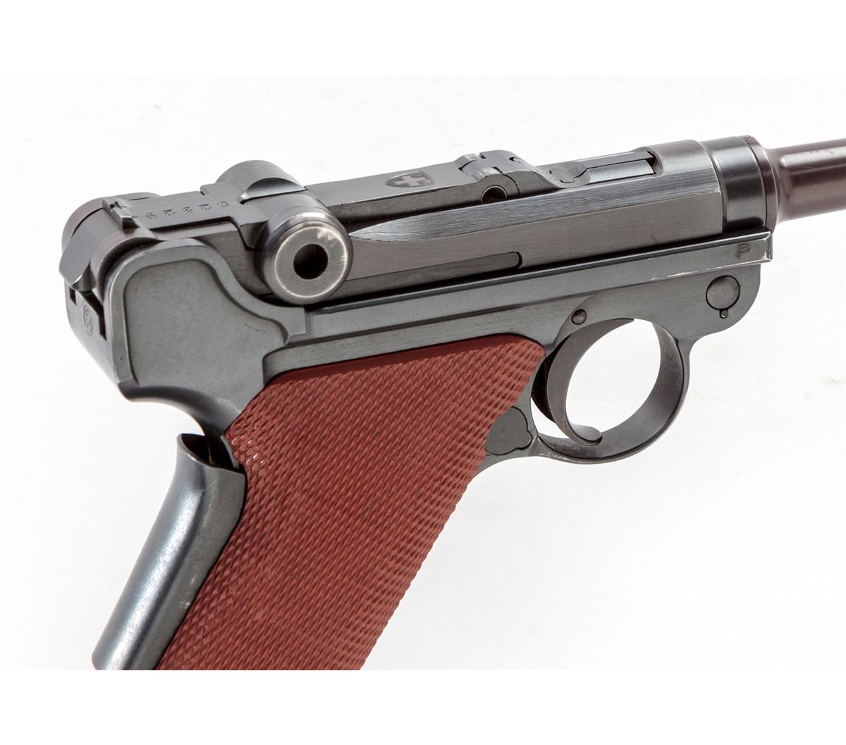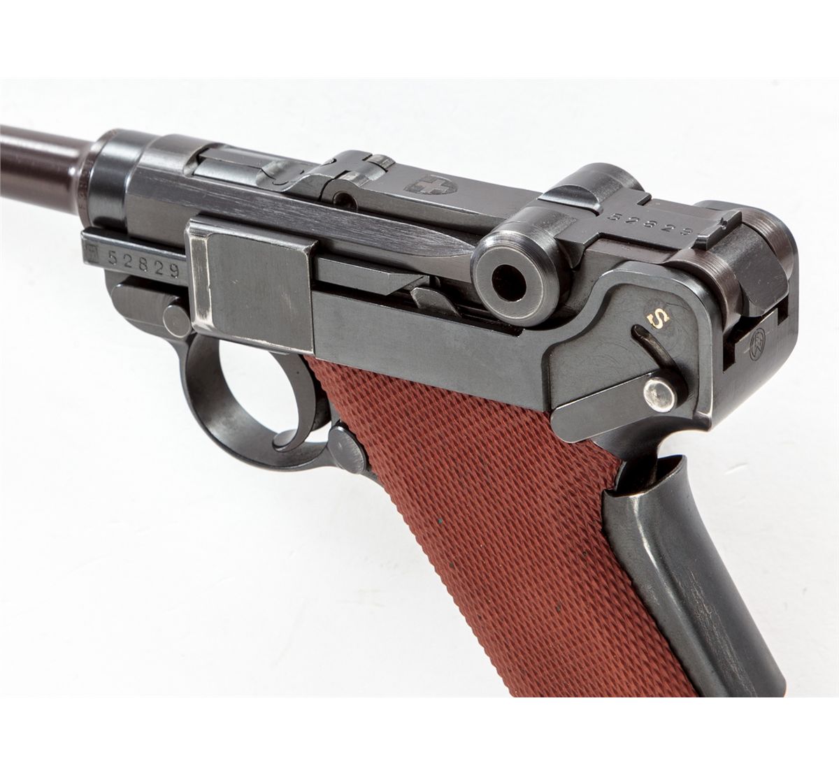 Swiss Model 1929 Luger Semi-Automatic Pistol, #52829, .30 Luger cal., 4-3/4'' barrel, blue finish, red checkered plastic grips, with one original magazine. Condition is excellent with very light edgewear and minor scuffing from handling. Lightly import marked to bottom edge of frame (near imperceptible). Grips are crisp with one small loss at heel of left panel. Action is crisp, bore is bright. Est.: $1,000-$1,500. (C&R)