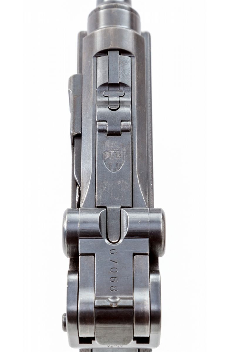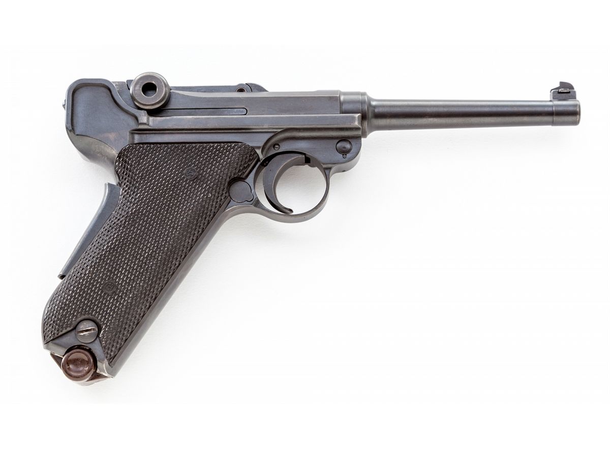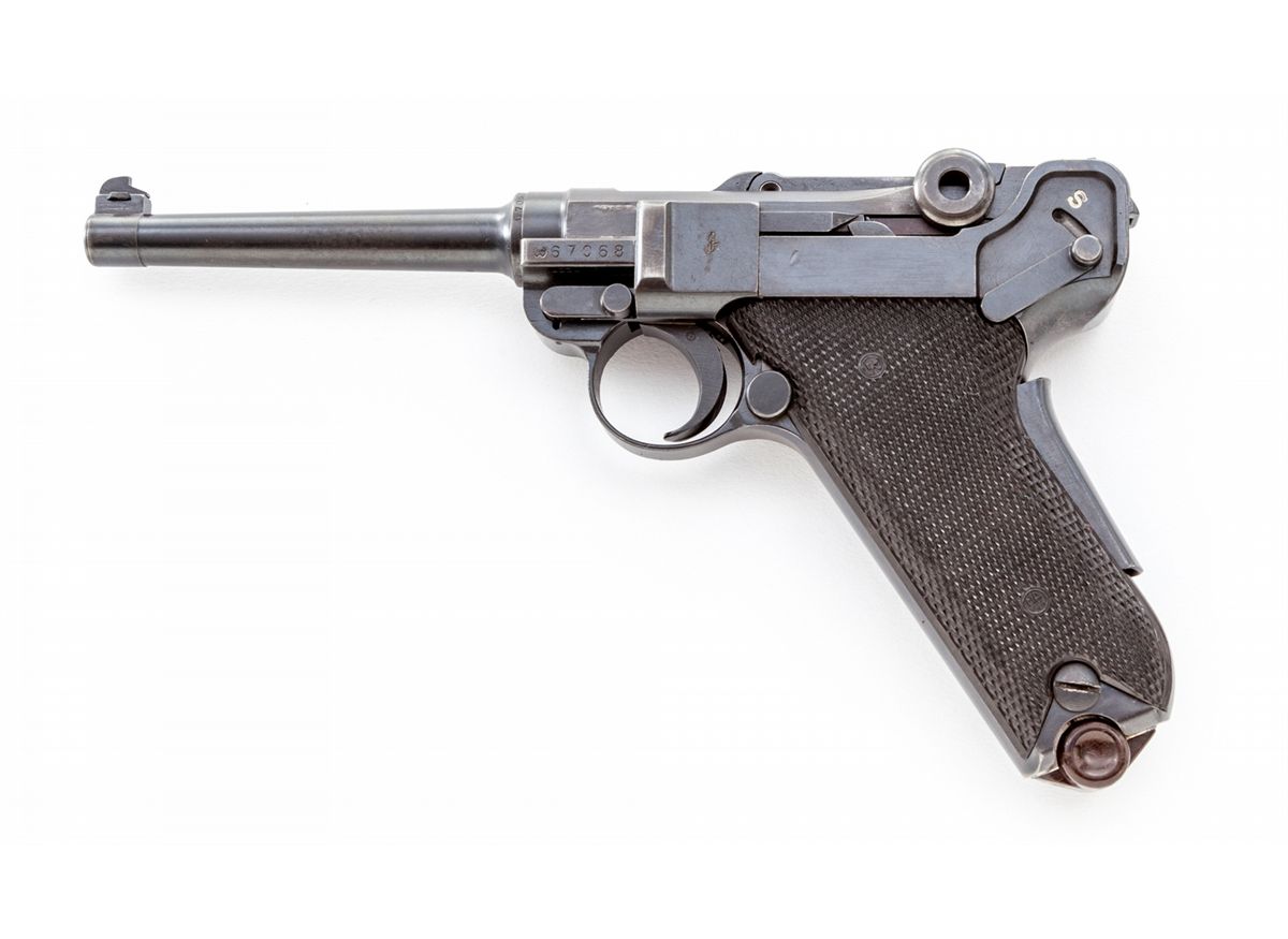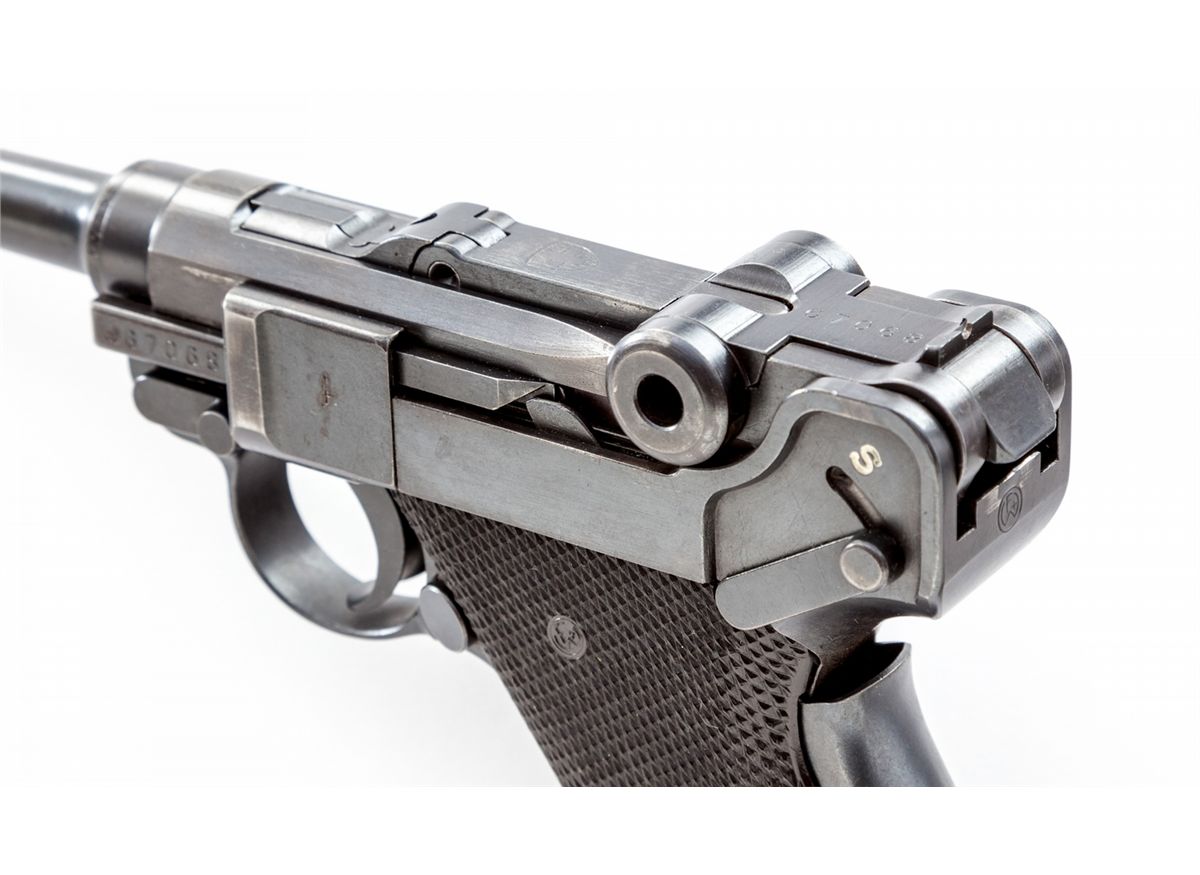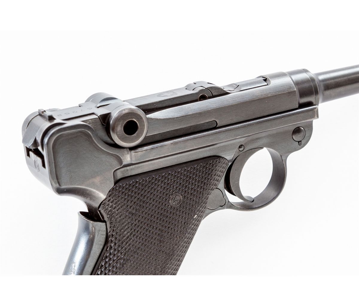 Swiss Model 1929 Luger Semi-Automatic Pistol, #67068, .30 Luger cal., 4-3/4'' barrel, blue finish, black checkered plastic grips, with one original magazine. Condition is excellent with very light edgewear and minor scuffing from handling, with one ¬'' nick to center flat of sideplate. Lightly import marked to bottom edge of frame (near imperceptible). Action is crisp, bore is bright. Est.: $1,200-$1,800. (C&R)