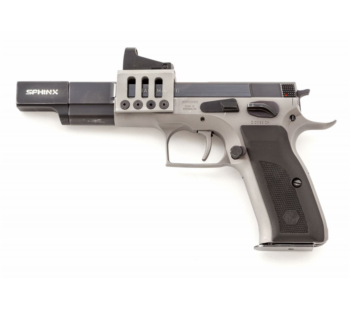 Swiss Sphinx Grand Master Semi-Automatic Competition Pistol, #C01152CH, 9mm, 5'' compensated barrel, two-tone finish, with J-Point Red Dot sight system, and one high-capacity magazine by MEG-GAR. Condition is near excellent with both left and right sides having been drilled for optic mounts, with currently only the left side holes being utilized. Approx. 96% blue remains. Grips and action are crisp, trigger pull is smooth and light, bore is bright. Est.: $800-$1,200. (Modern) (Not available to Calif. residents.)