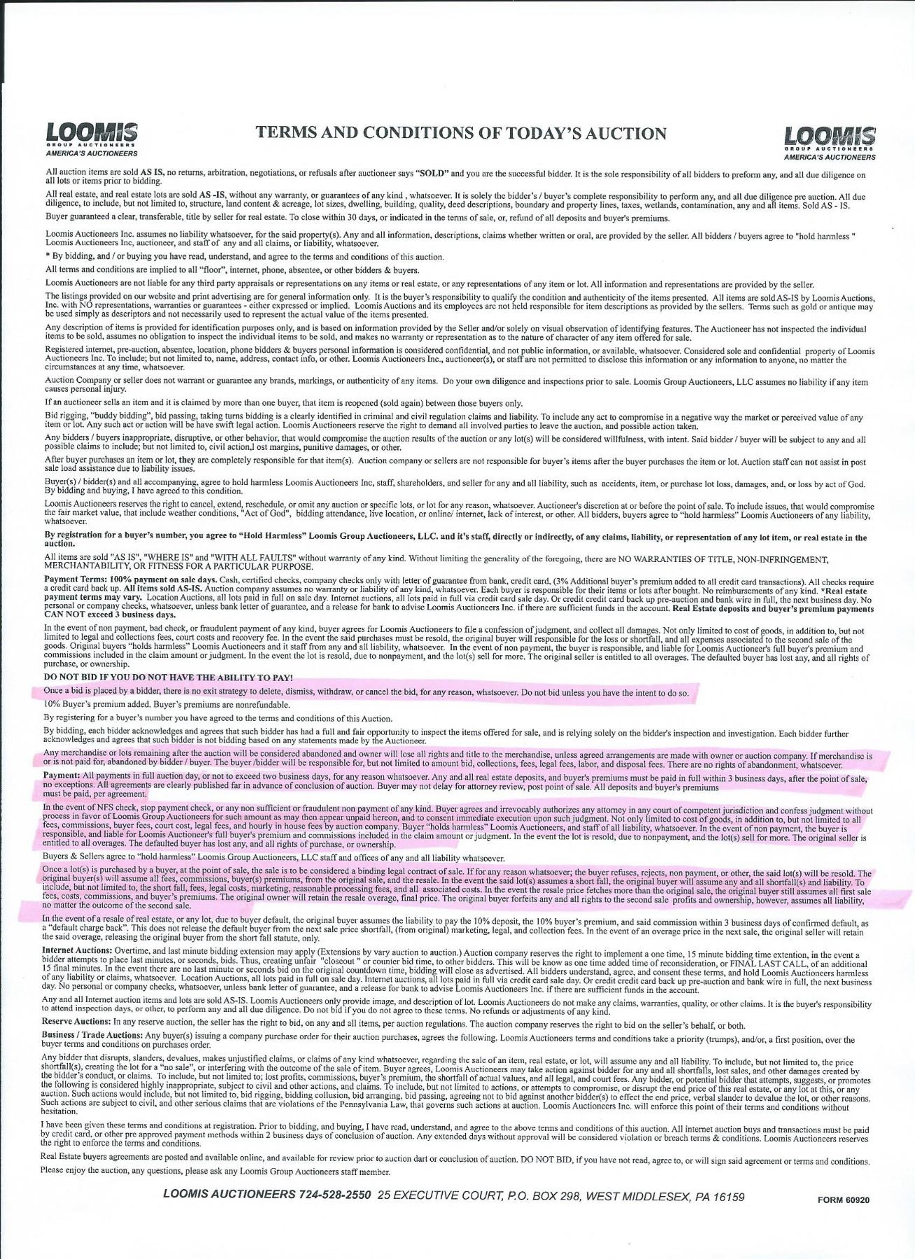 WARNING: DO NOT BID IF YOU CAN NOT PAY, HAVE ANY INTENTIONS WHATSOEVER OF NOT PAYING, OR ABANDON THE GOODS AND NOT PAYING. LOOMIS AUCTIONEERS WILL FILE LEGAL ACTION AT ONCE, NO MATTER THE AMOUNT SMALL OR LARGE. BID, BUY, AND PAY WILL GIVE YOU A GREAT AUCTION EXPERIENCE WITH LOOMIS AUCTIONEERS.