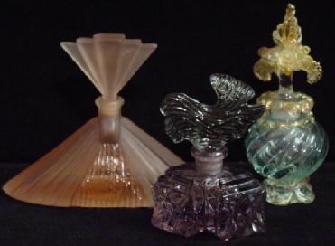 , early / mid 20th C. (A) clear and frosted art deco salmon pink glass, original stopper, circa 1930's, "Czechoslovakia", height 4 ¾". (B) Venetian glass footed swirl in periwinkle blue floral, gold fleck stopper, 5 ½" tall. (C) Amethyst cut glass in art deco manner by Irice with grey stopper, original paper label, Czechoslovakia, circa 1930's.