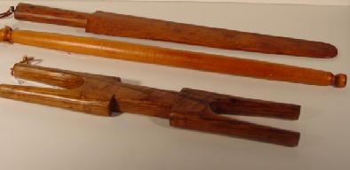 (A) hickory smoother, early 20th C. (B) maple narrow rolling pin, early 20th C. (C) hickory bed wrench, 19th C.