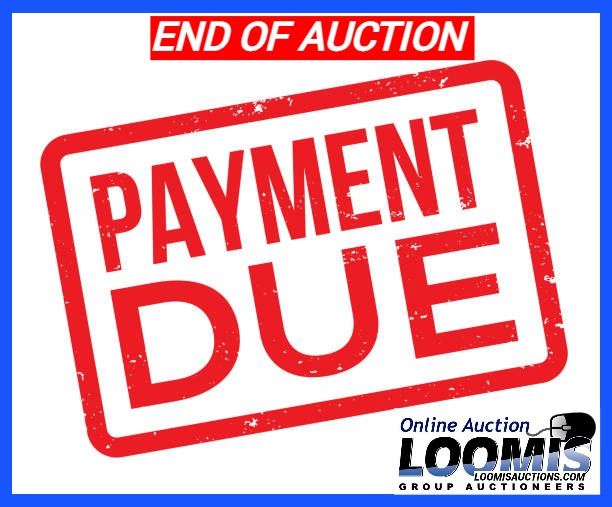 Payment Terms: 100% payment on sale days. Cash, certified checks, company checks only with letter of guarantee from bank, credit card, (4.5% Additional processing fee added to all credit card transactions). All checks require a credit card back up. All items sold AS-IS. Auction company assumes no warranty or liability of any kind, whatsoever. Each buyer is responsible for their items or lots after bought. No reimbursements of any kind. *Real estate payment terms may vary. Location Auctions, all lots paid in full on sale day. Internet auctions, all lots paid in full via credit card sale day. Or credit credit card back up pre-auction and bank wire in full, the next business day. No personal or company checks, whatsoever, unless bank letter of guarantee, and a release for bank to advise Loomis Auctioneers Inc. if there are sufficient funds in the account. Real Estate deposits and buyer’s premium payments CAN NOT exceed 3 business days.