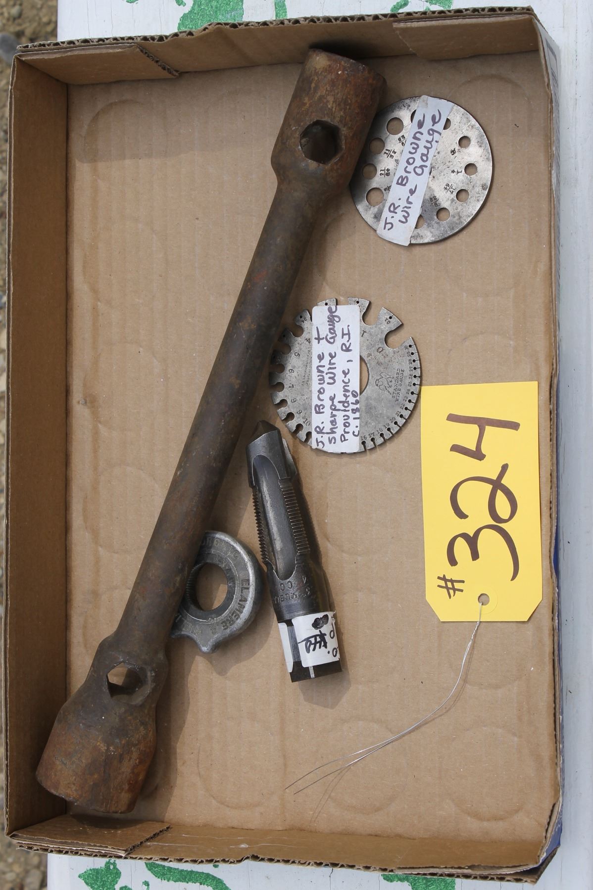 TIRE WRENCH, 2 - J.R. BROWNE WIRE GAUGES, DELAMERE & WILLIAMS TOOL, MUELLER TAP