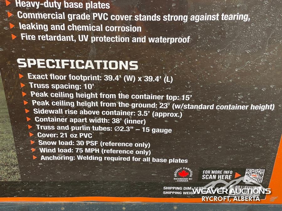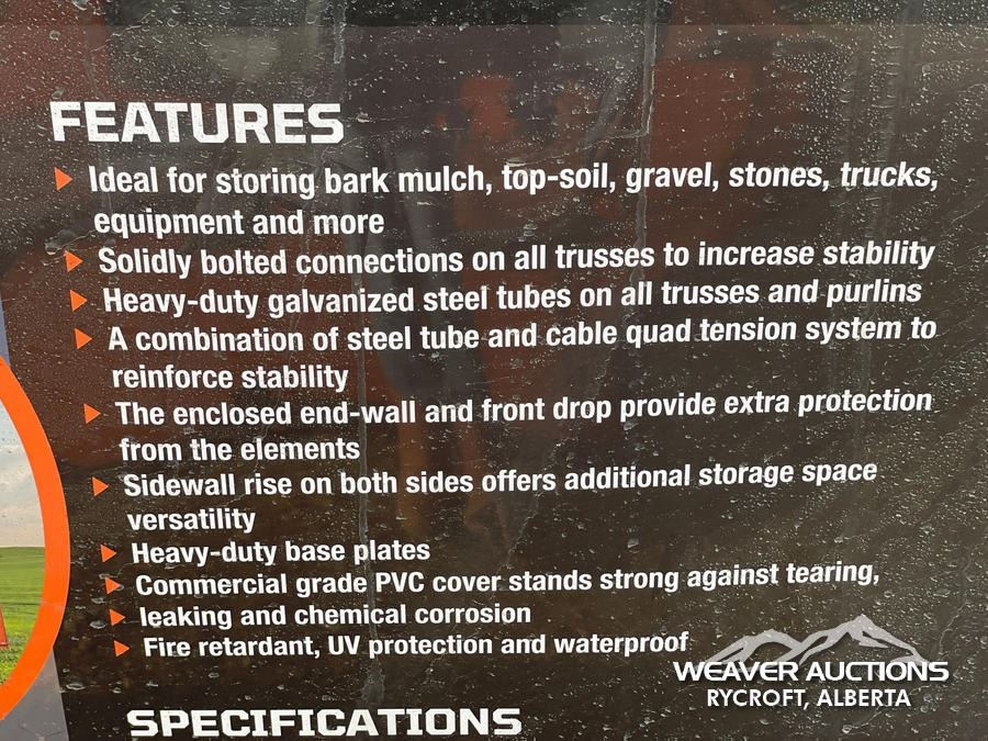 Specifications: *UNUSED, 21 OZ PVC COVER, ENCLOSED END WALL & FRONT DROP