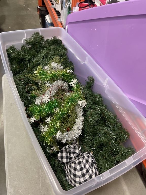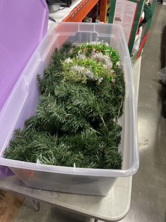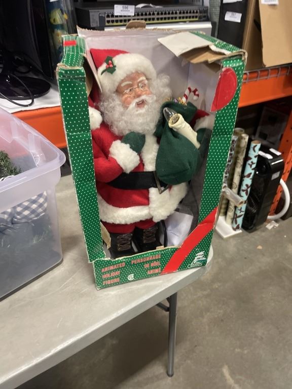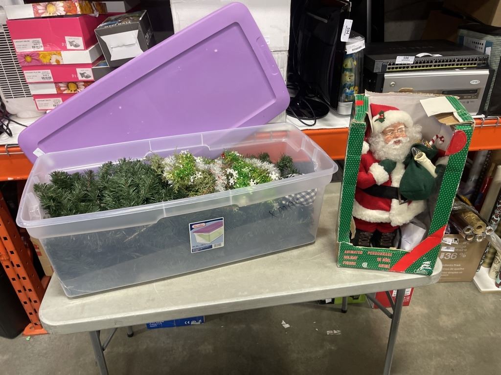 TOTE WITH CHRISRTMAS DECOR, FAKE TREE AND SANTA FIGURE