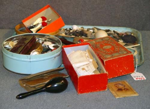TRAY LOT SEWING ITEMS INCL BUTTONS AND SEWING BIRD