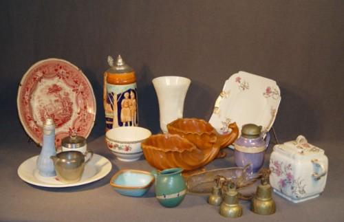 TRAY LOT W/ POTTERY VASES, STEIN, EGG CODDLER, ETC