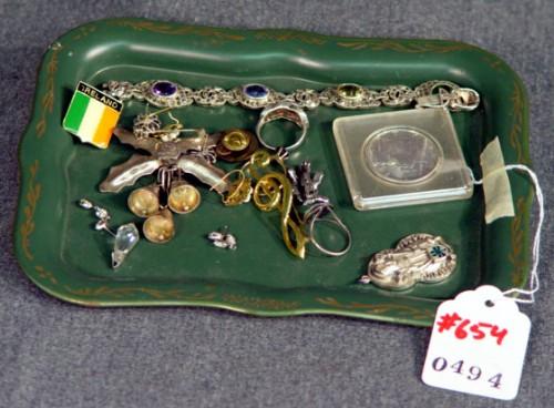 TRAY LOT WITH STERLING JEWELRY, KENNEDY HALF, ETC.