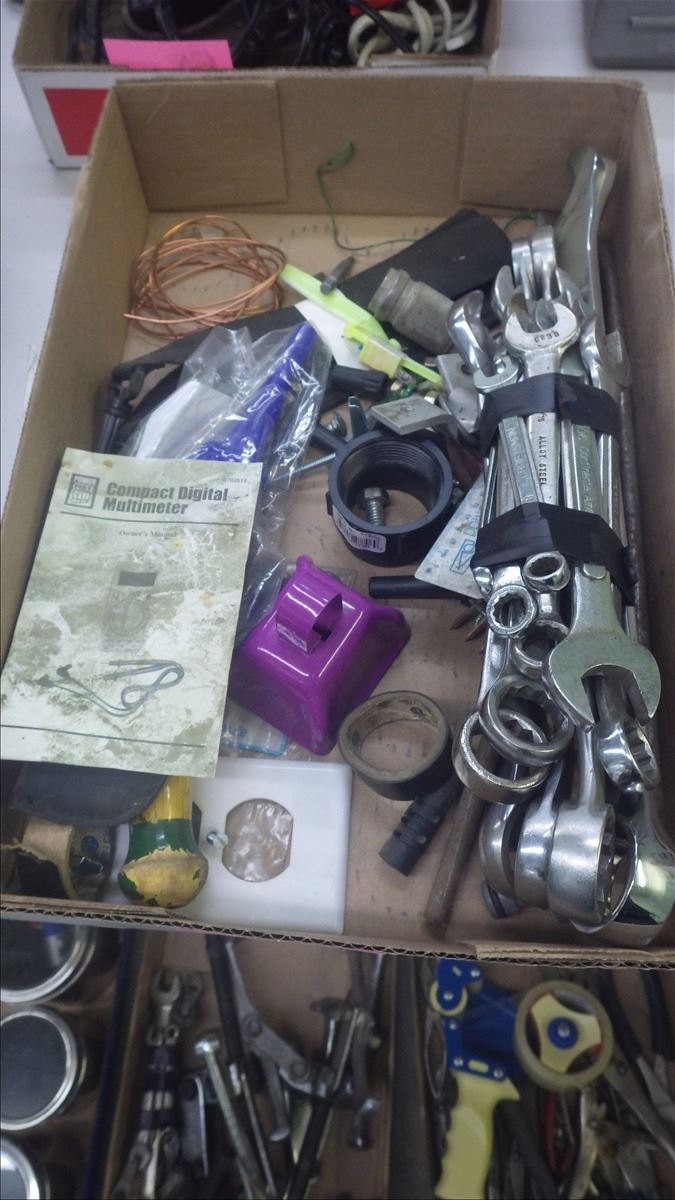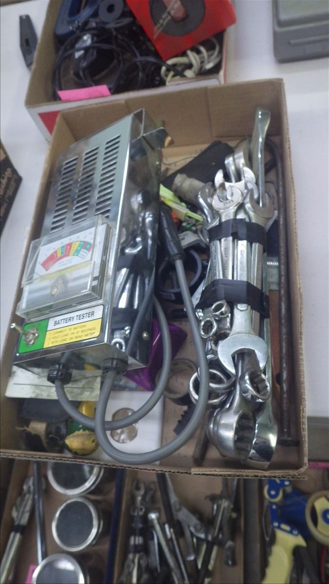 TRAY WITH BATTERY TESTER, BUNDLE OF WRENCHES, PLUS MISC TOOLS